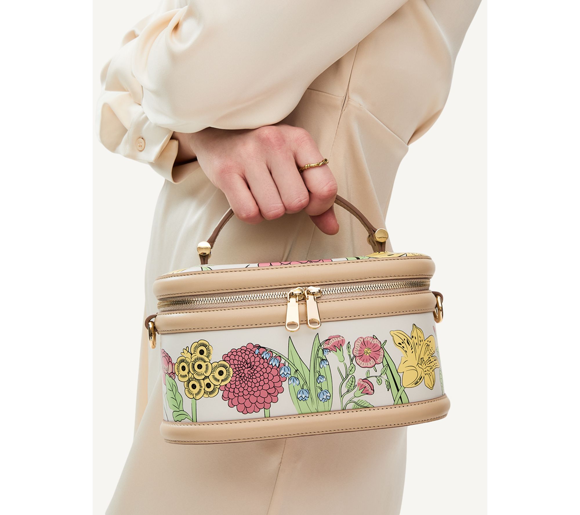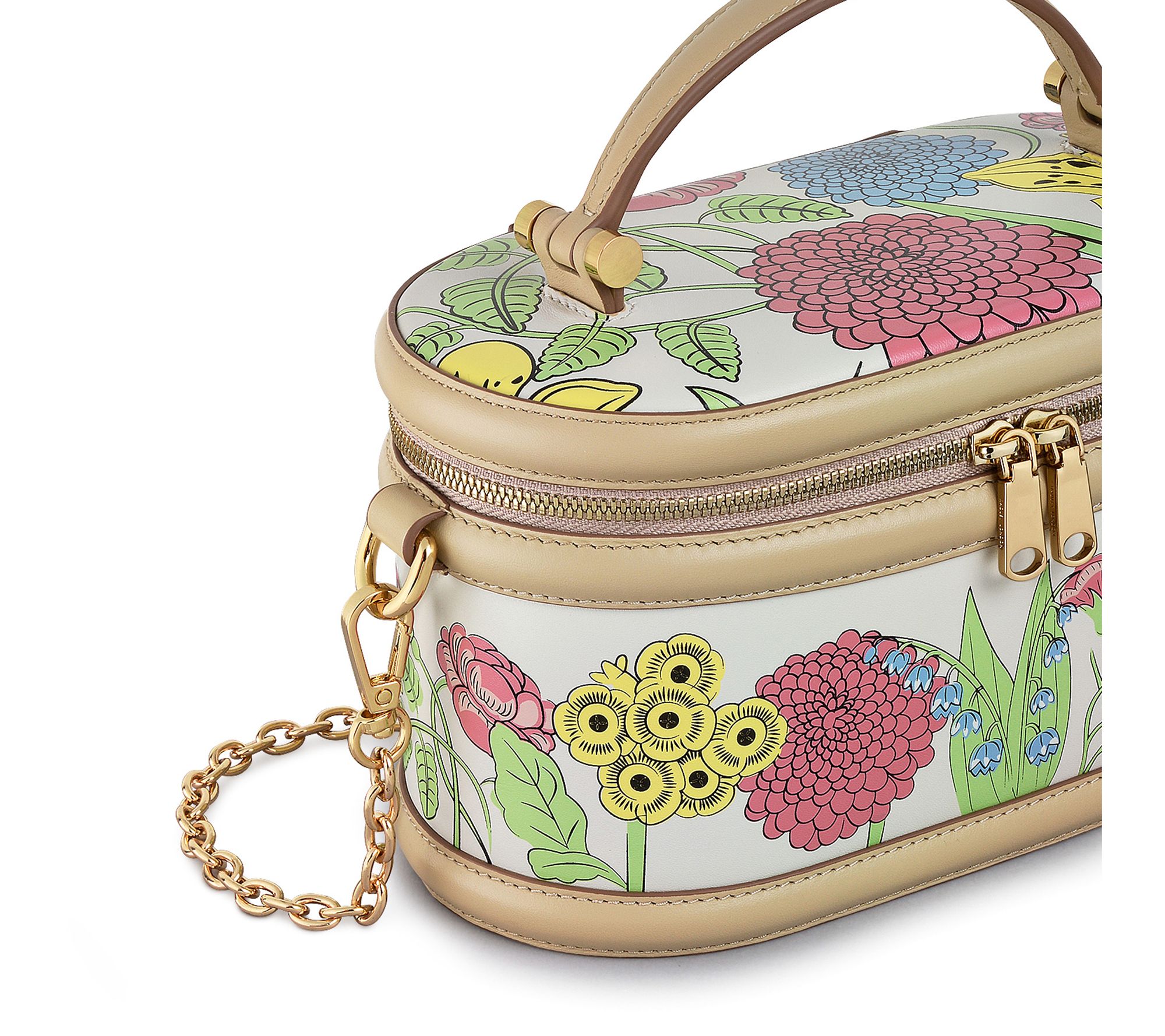 • Floral prints, color embossed details, goldtone hardware