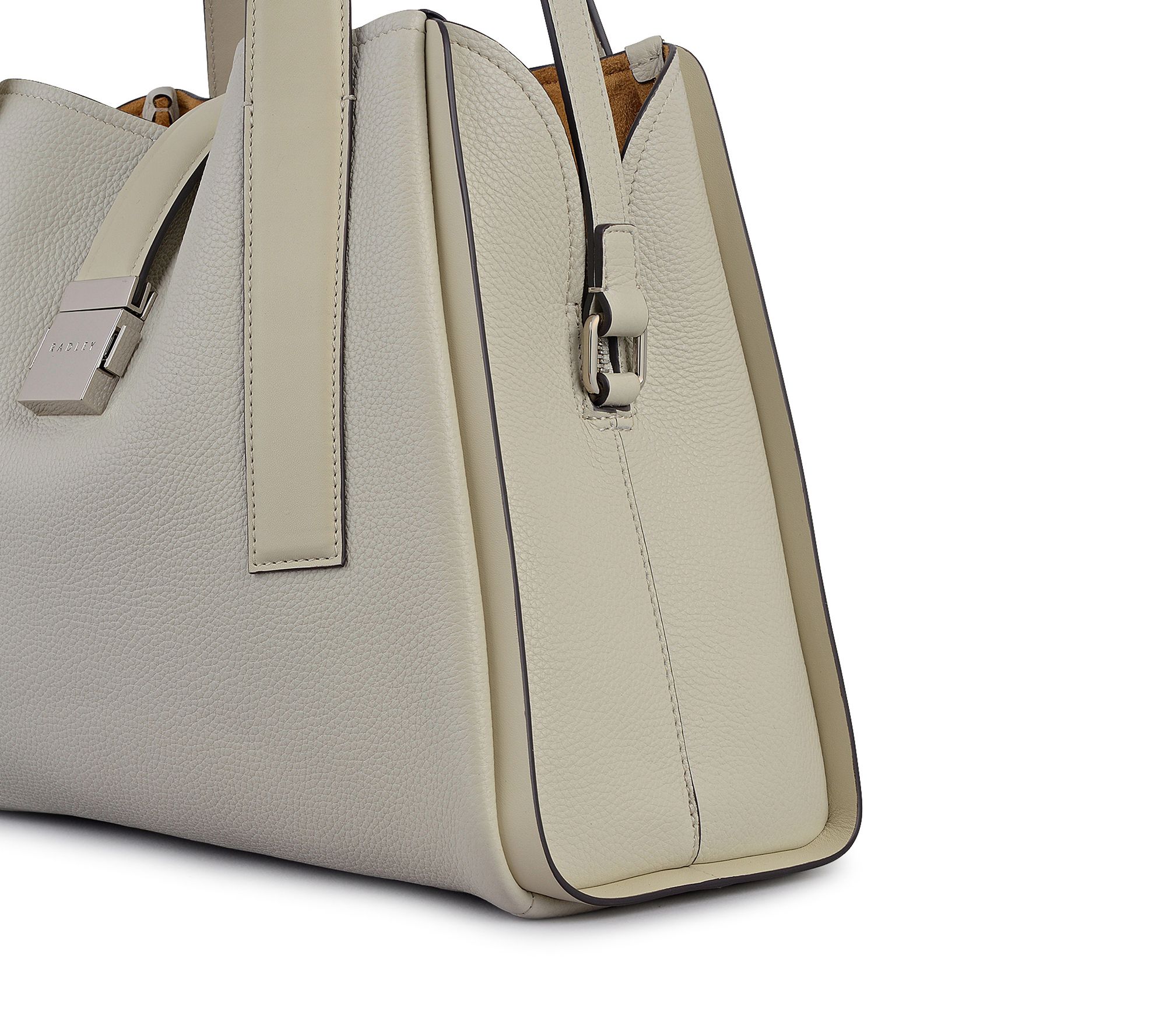 Grain leather exterior with smooth trims, inverted seams, branded push lock hardware, double grab handles, detachable crossbody strap, back slip pocket, metal feet