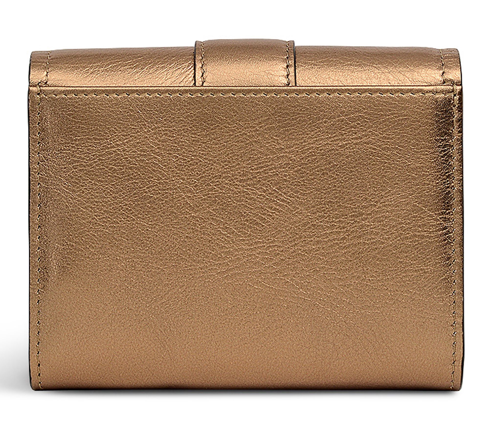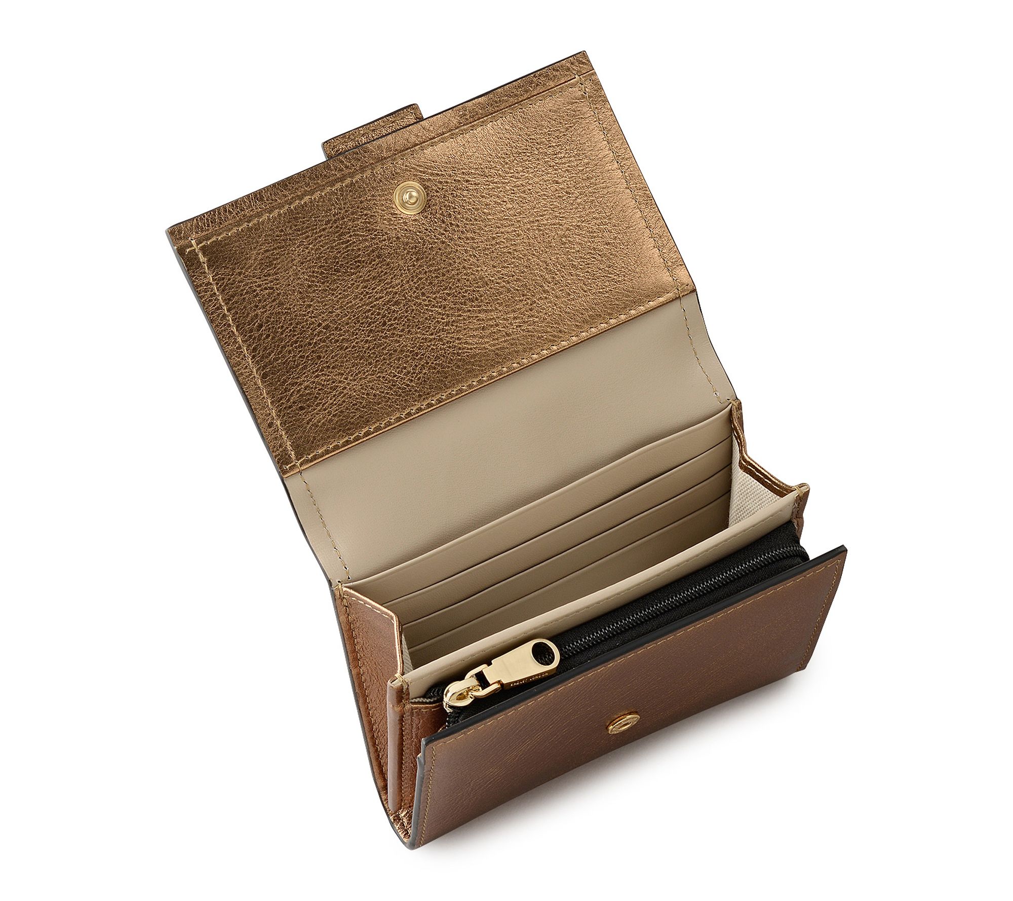 • Flap with layered edge detail, rectangular tab with foil logo, press stud fastening, goldtone hardware, slip back pocket