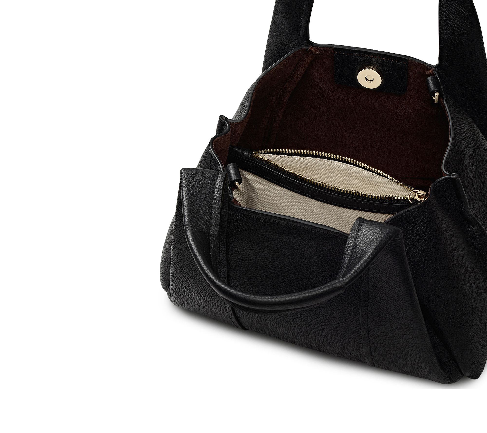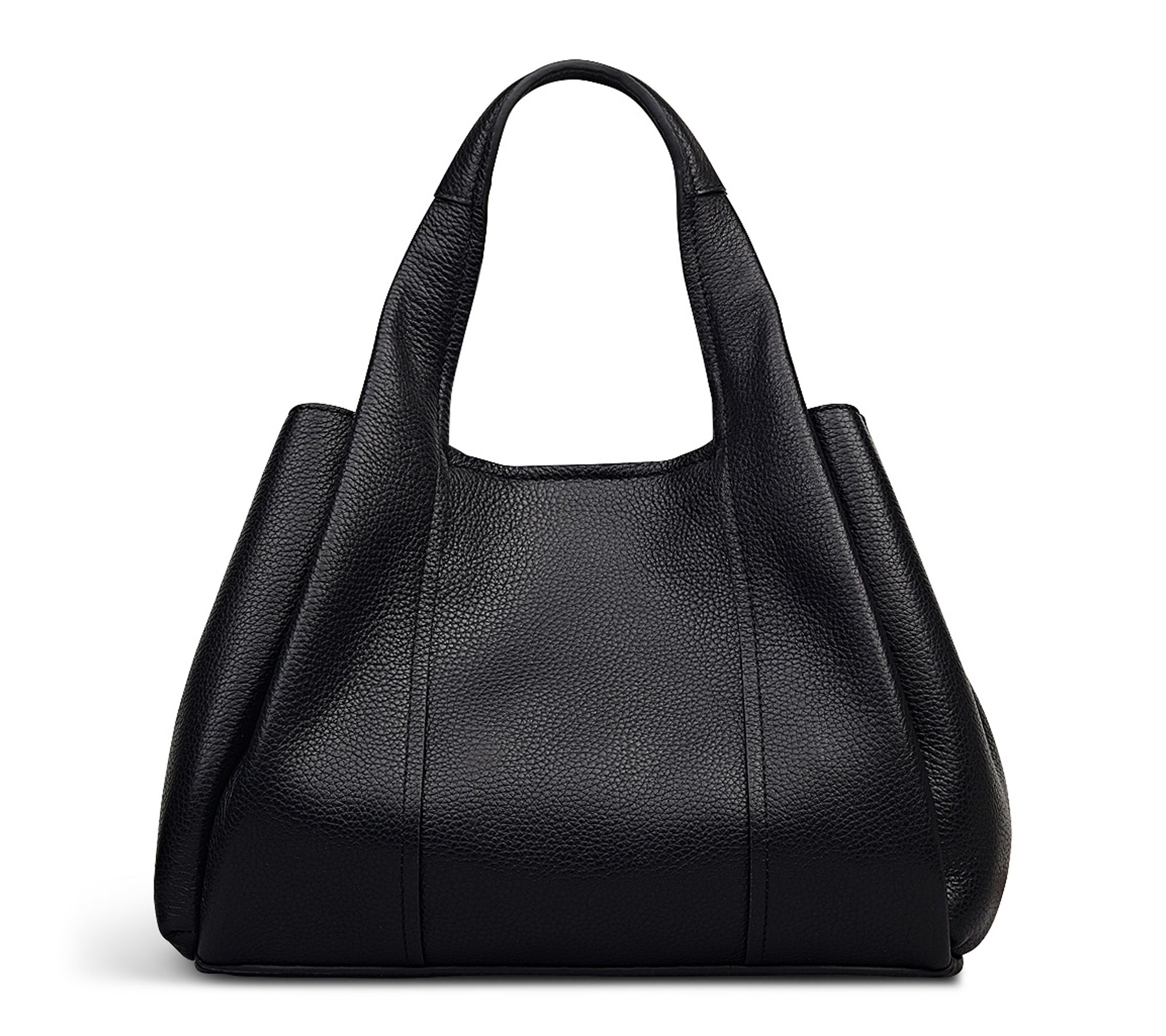 • Grab handles extend into pleated trims, zip top closure, leather tab with magnetic fastening, detachable crossbody strap, goldtone hardware, foil logo, logo-embossed tag, split ring hardware