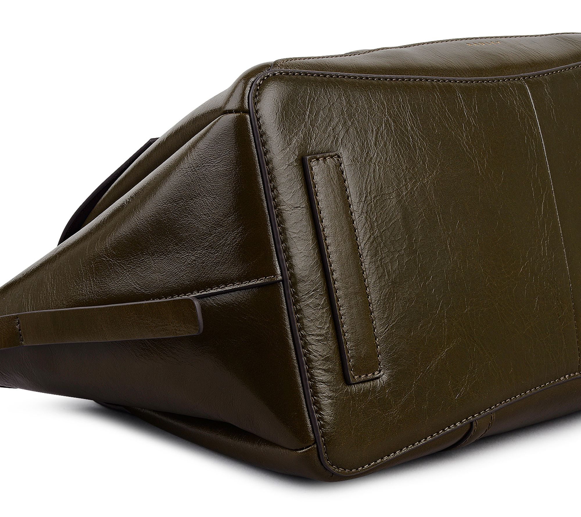 • Crinkle sheen calf leather exterior; curved logo trim; slim padded double handles; push-lock clasp; cut-out flap fits around handles; light goldtone hardware