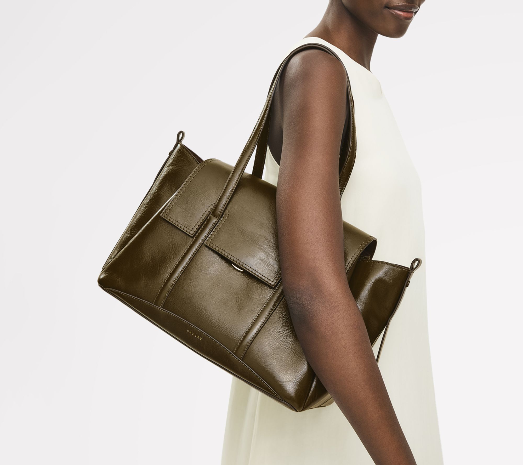 Radiant crinkle sheen leather and glowing goldtone hardware bring bold sophistication to this medium shoulder bag, whether you're meeting friends for brunch or heading to the office. With three spacious compartments, a neatly cut flapover design, and padded handles that rest comfortably on your shoulder, it's ready for busy weekdays or weekend getaways. From Radley.