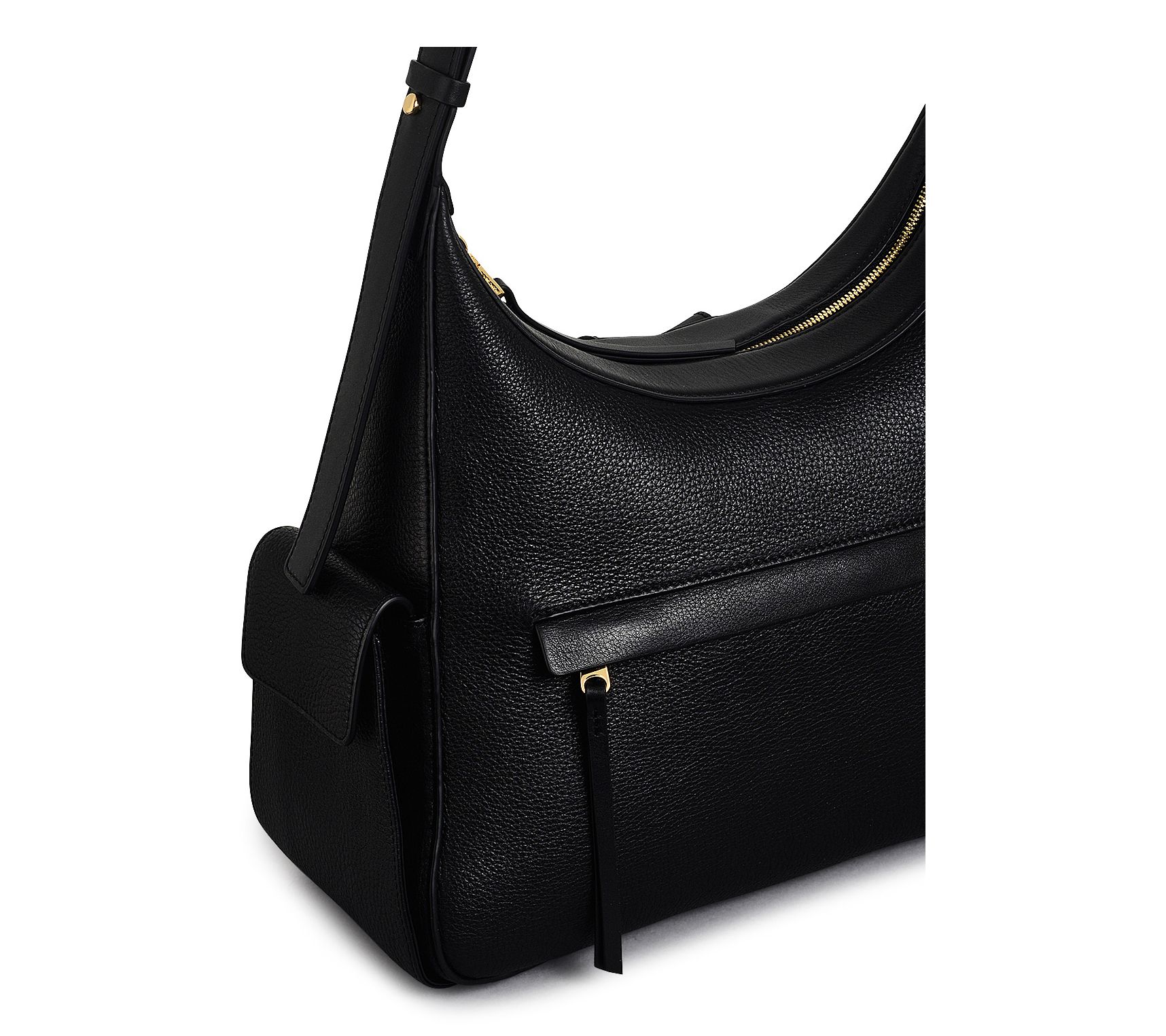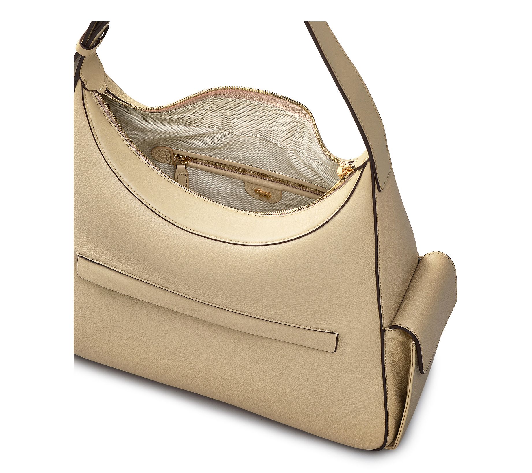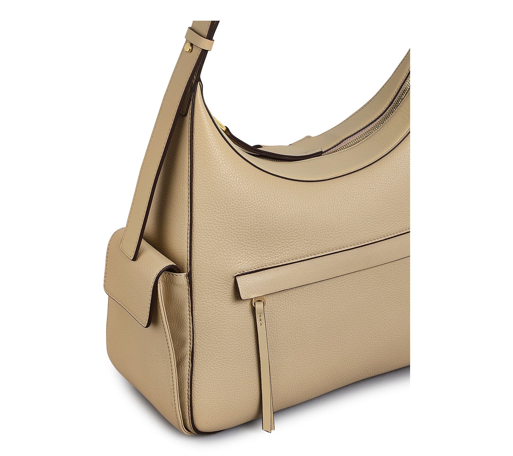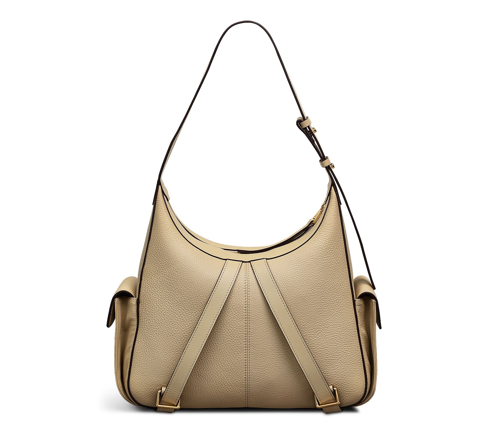 Zip top closure; single adjustable handle; adjustable double leather shoulder straps; two exterior zip pockets; two side flapover pockets