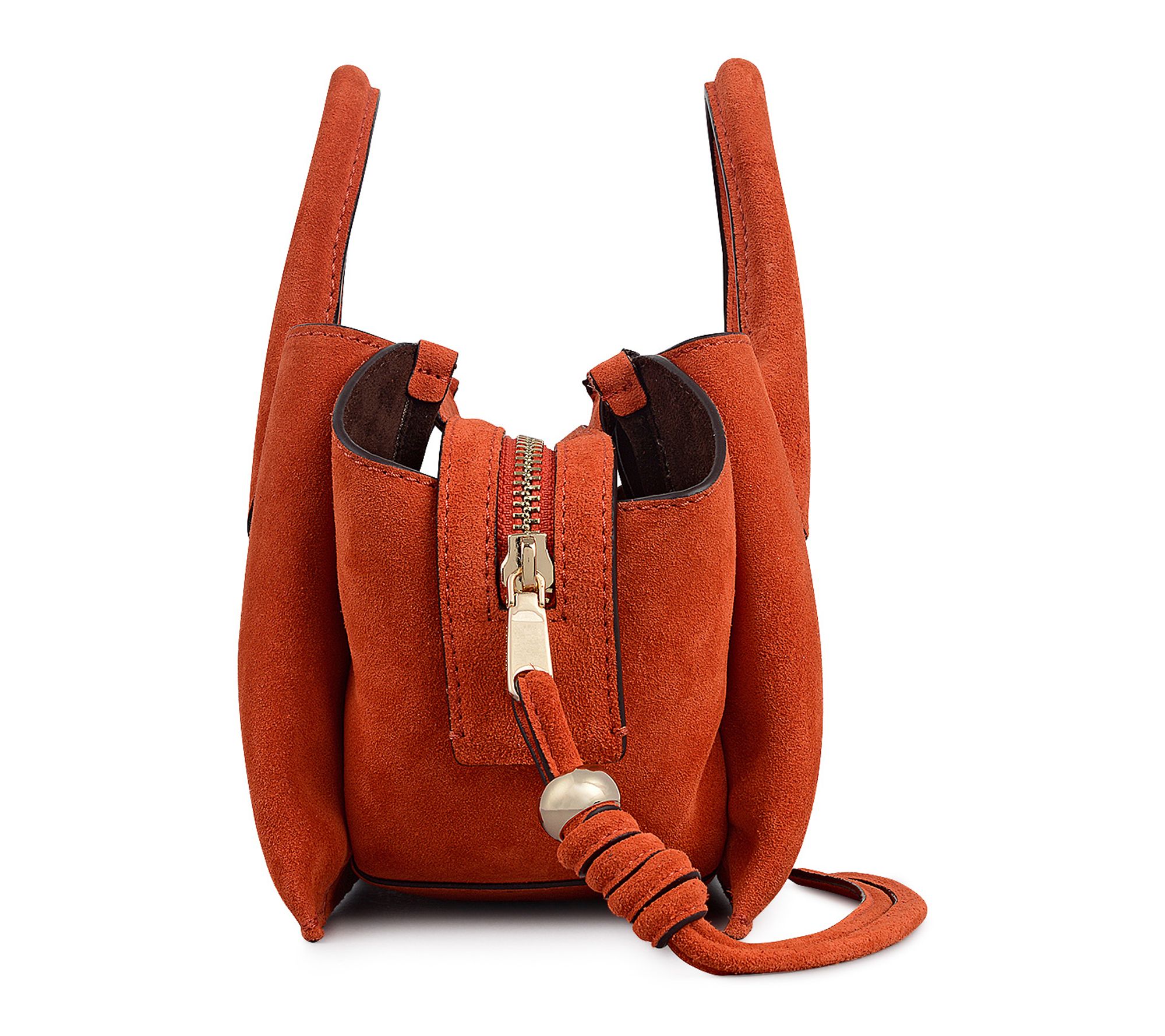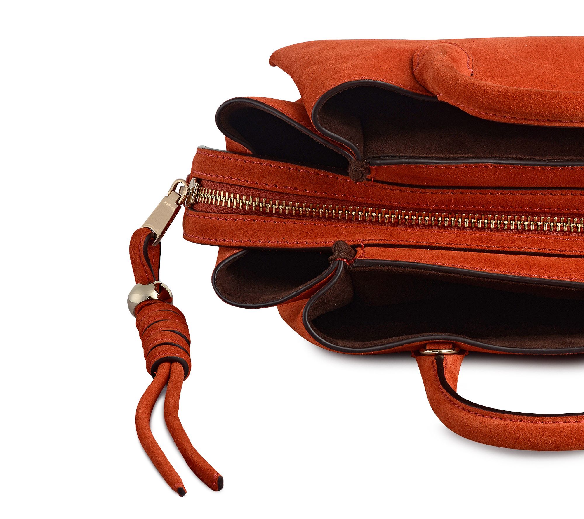• Three interior compartments; center zipped section; interior pocket; bonded faux suede lining