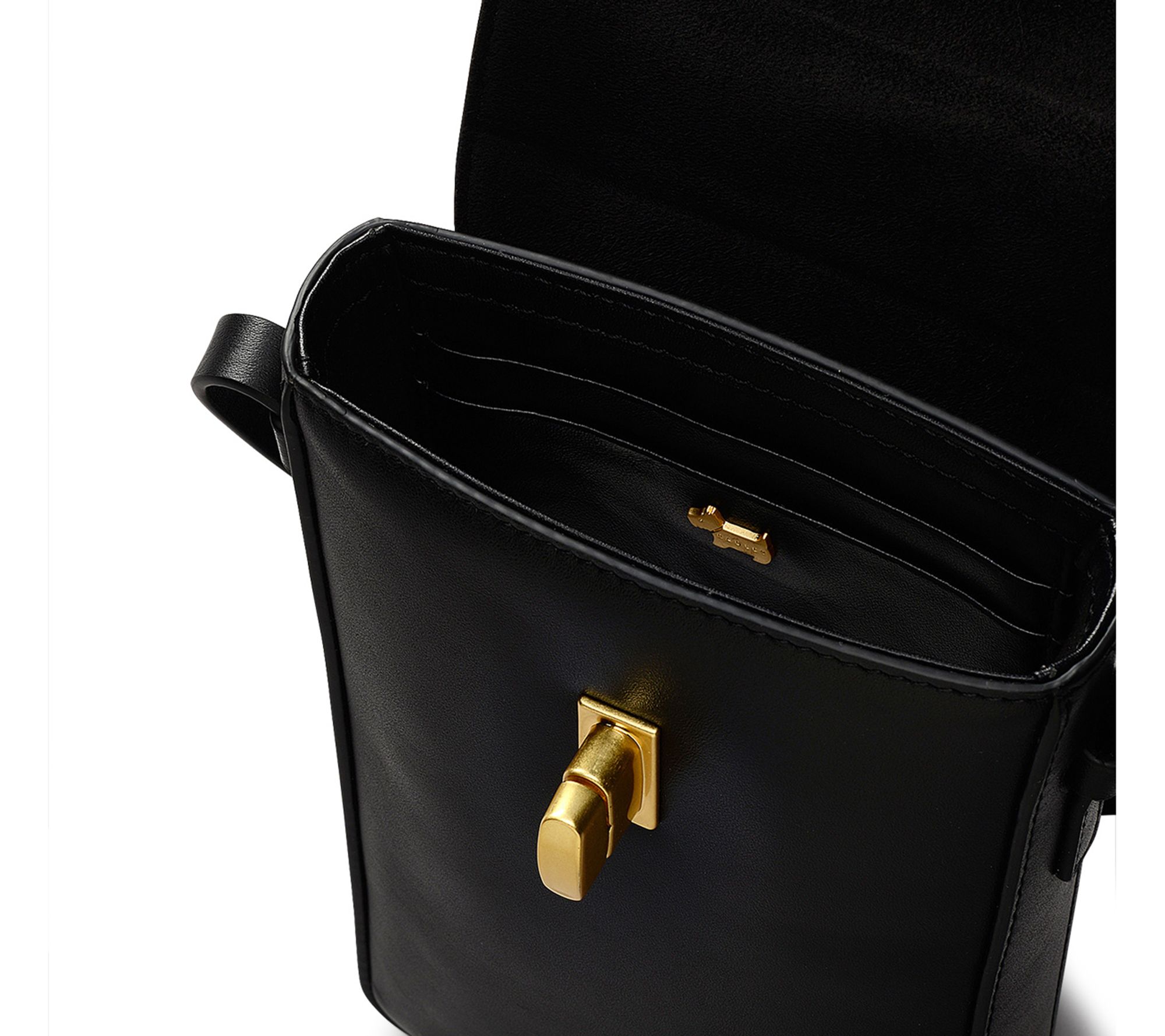 • Flap with turn-lock closure, adjustable strap, patch logo, goldtone hardware