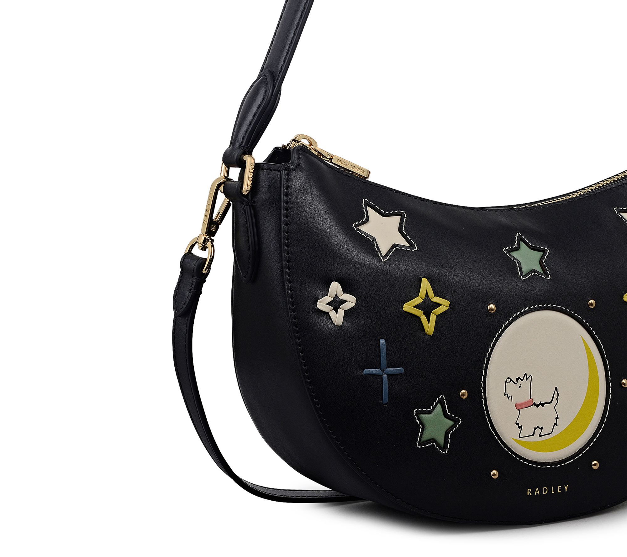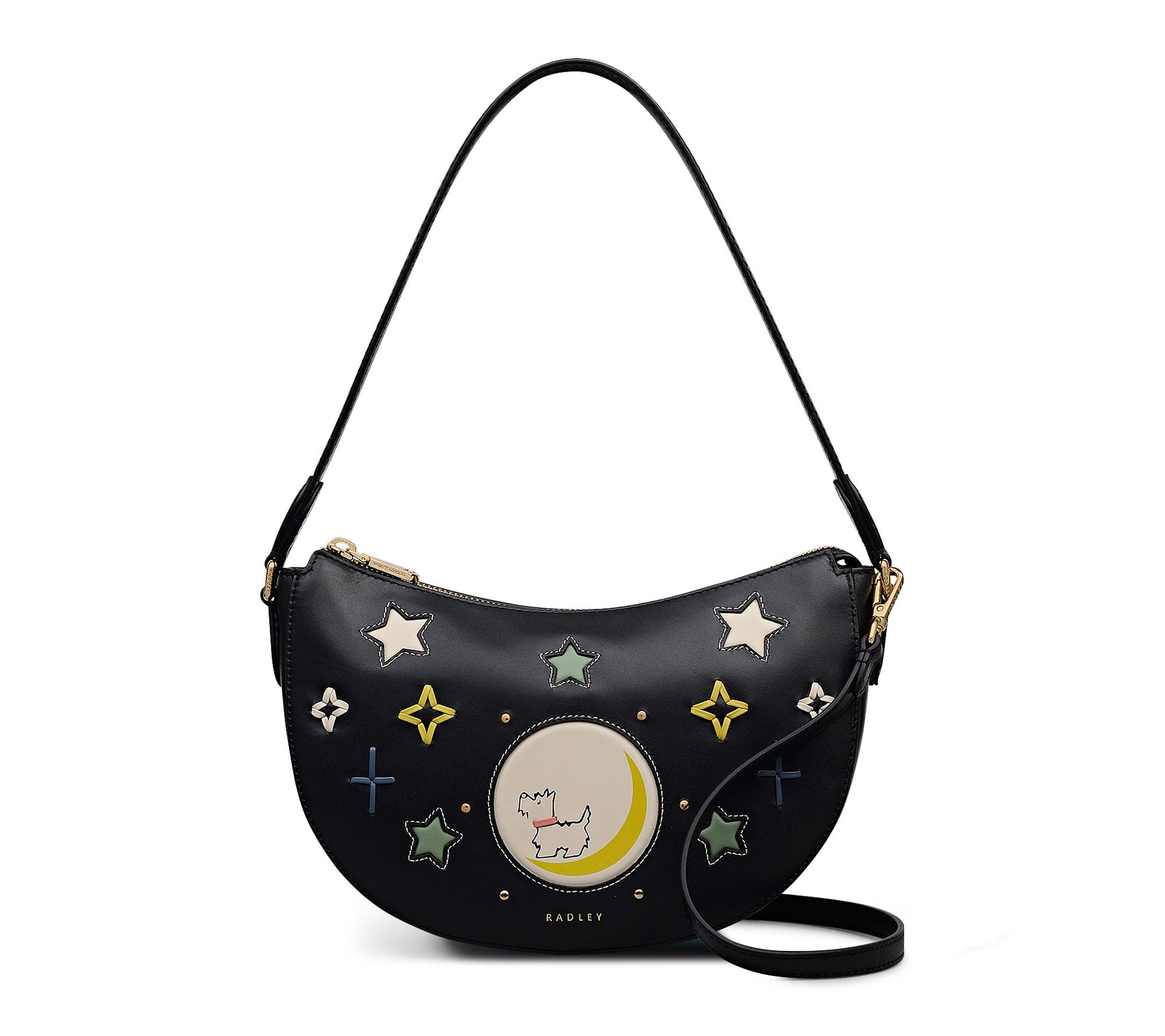 From brunch dates to evenings under the stars, this small zip top shoulder bag brings a touch of whimsy to every outing with its smooth leather and celestial moon detailing. Effortlessly switch from a shoulder to crossbody style thanks to the detachable strap, making it easy to stay chic and organized on the go. From Radley London.