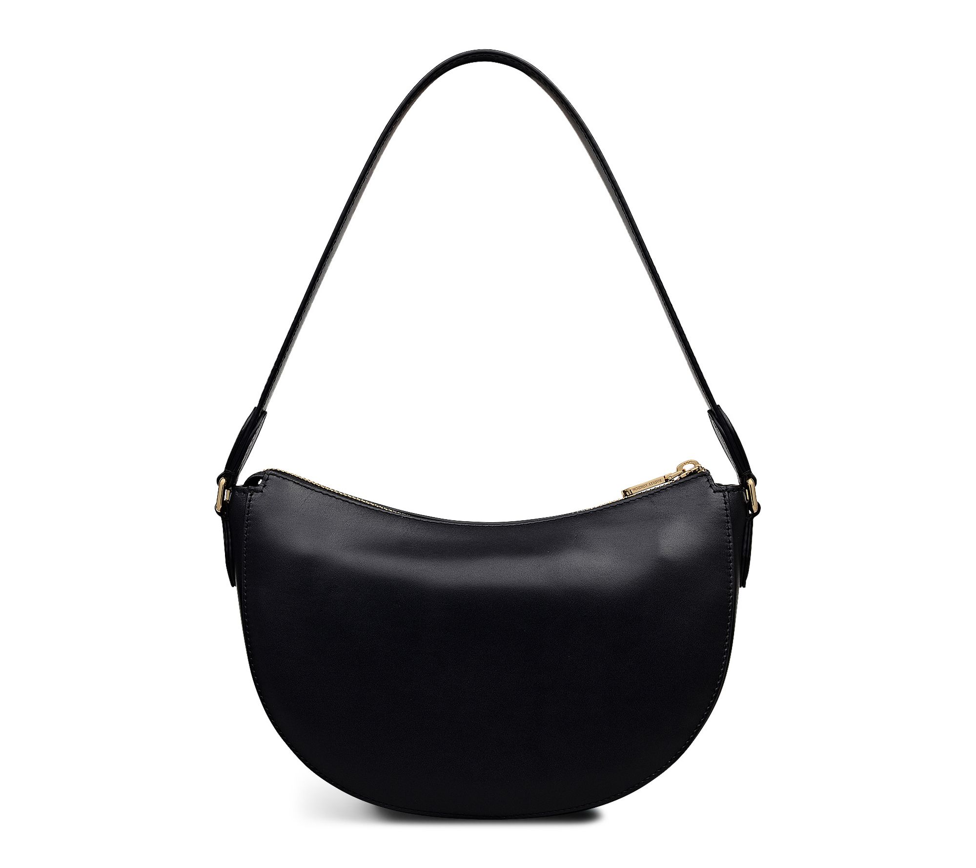 • Smooth leather exterior with padded moon inset, stitched outline, mini studs, foil logo, painted cut edges, scooped wide base, flat leather shoulder strap, zip top closure with branded metal puller, detachable adjustable crossbody strap