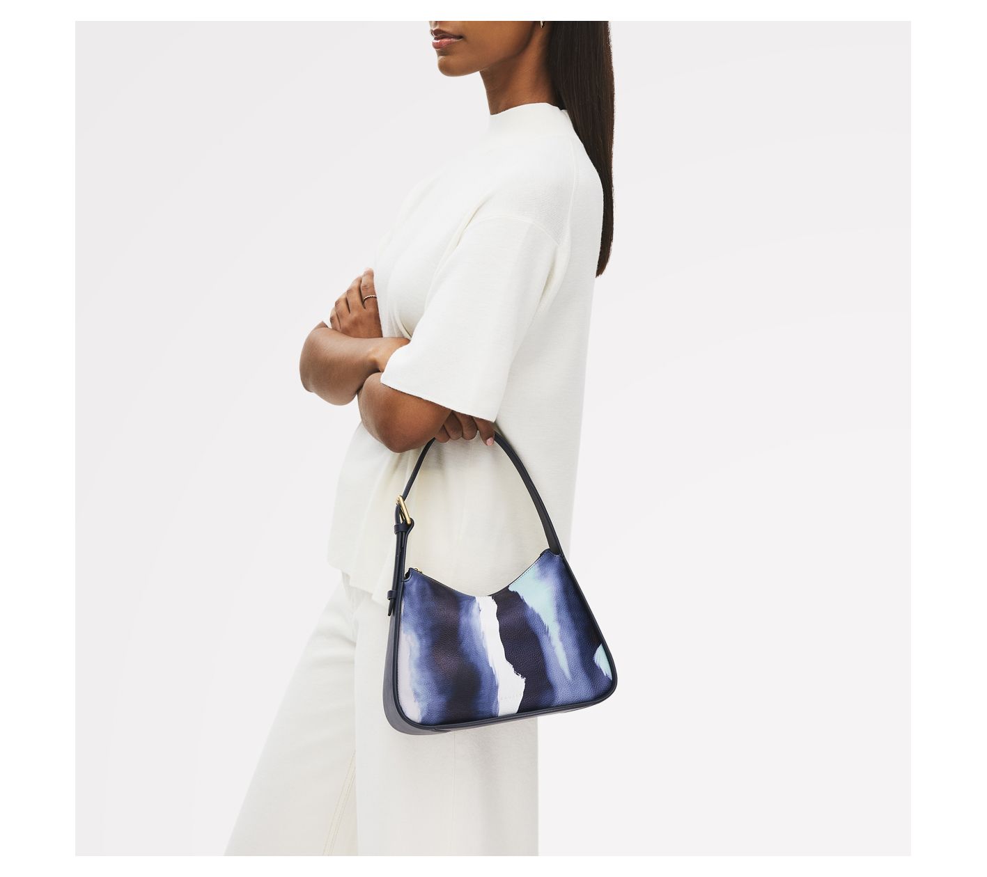 • Zip top closure; adjustable and detachable single handle with brushed goldtone buckle; detachable crossbody strap; digital stripe print; smooth leather trims; contrast stitching; branded zip puller; foil print; comes with dust bag