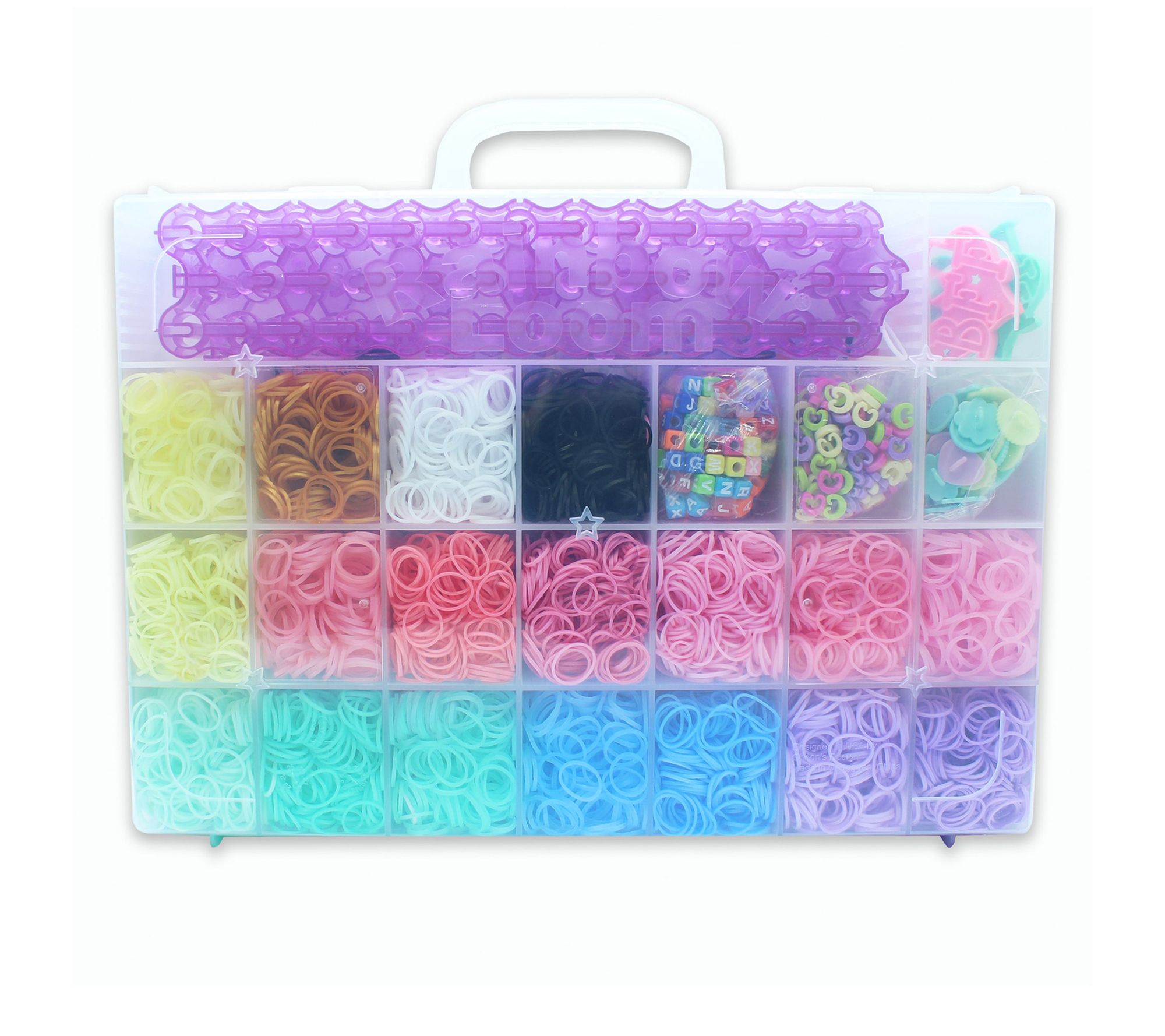 • Includes rainbow loom 2.0, two Happy Looms, two metal hooks, 6,800 rubber bands, 40 charms, 40 stickers, 300 beads, and 300 C-clips