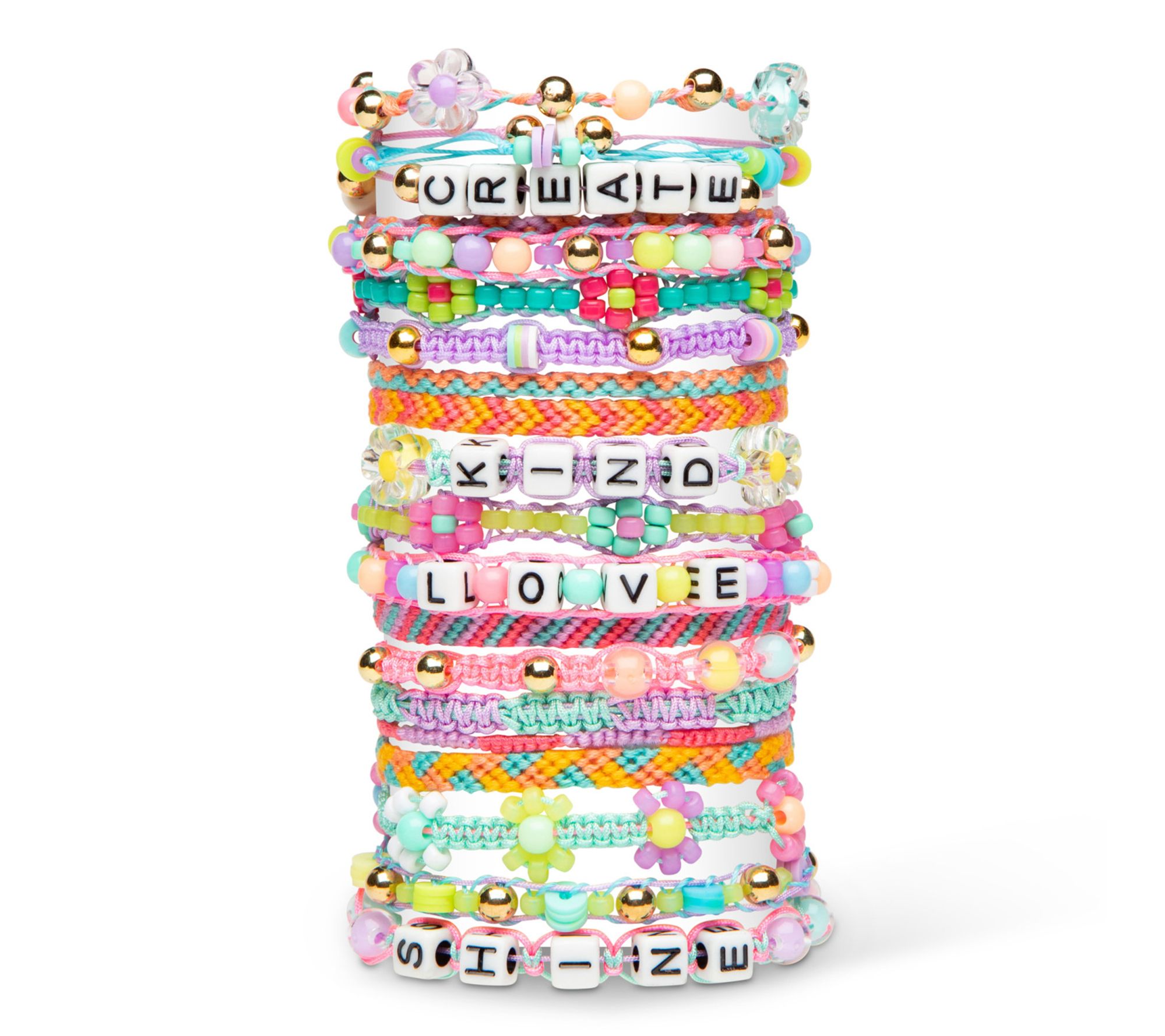 • Includes Wrapit Loom, three skeins nylon cord, two skeins polyester thread, five skeins cotton thread, 80 clay disc beads, 200 alphabet beads, 200 4mm acrylic beads, 50 6mm gold-colored beads, 50 assorted pastel beads, 10 acrylic flower beads, 10 10mm pastel beads, six rubber bands, 30 S-clasps, and instructions