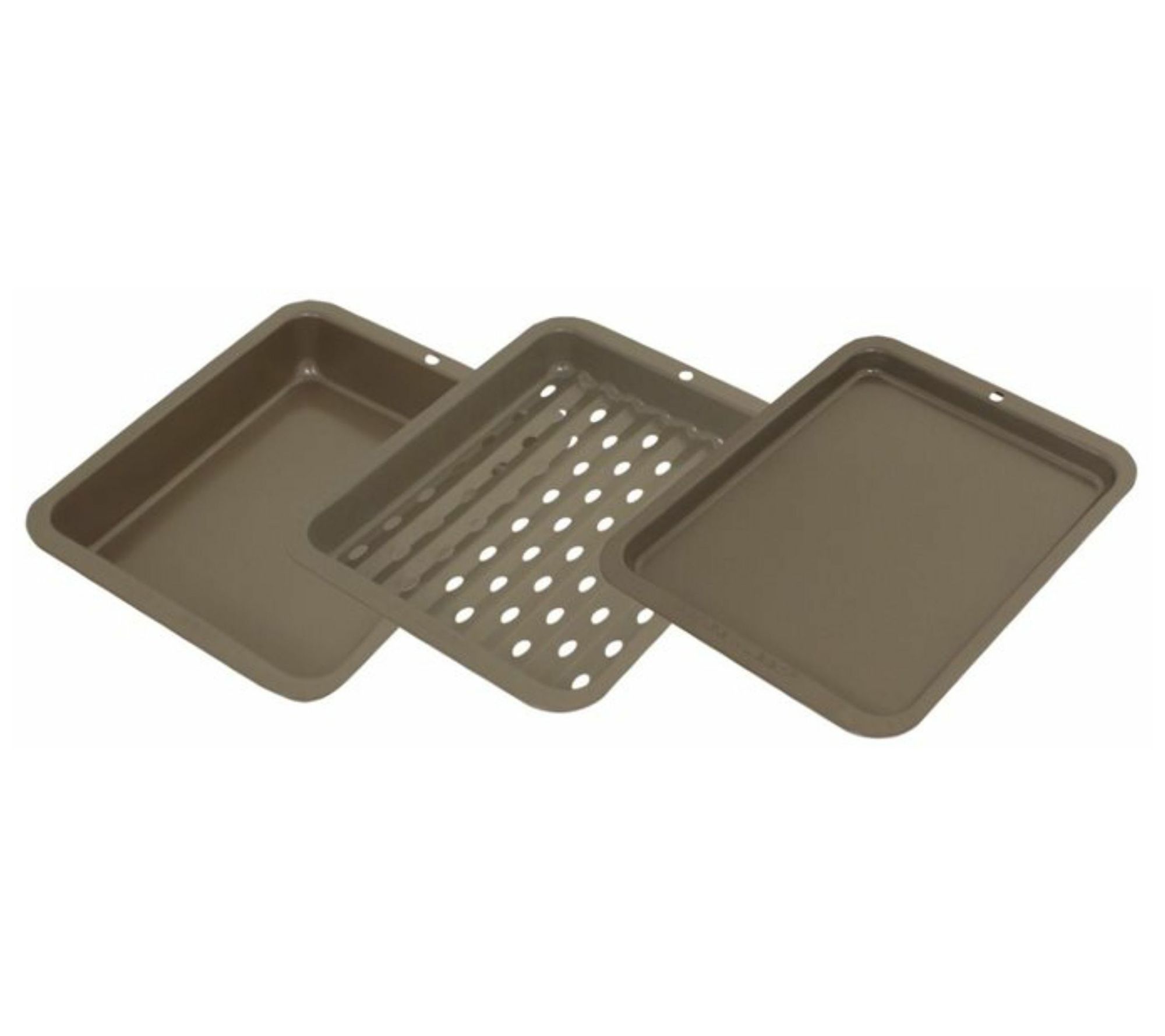 • Includes two-piece broiler pan and three toaster oven bakeware pans