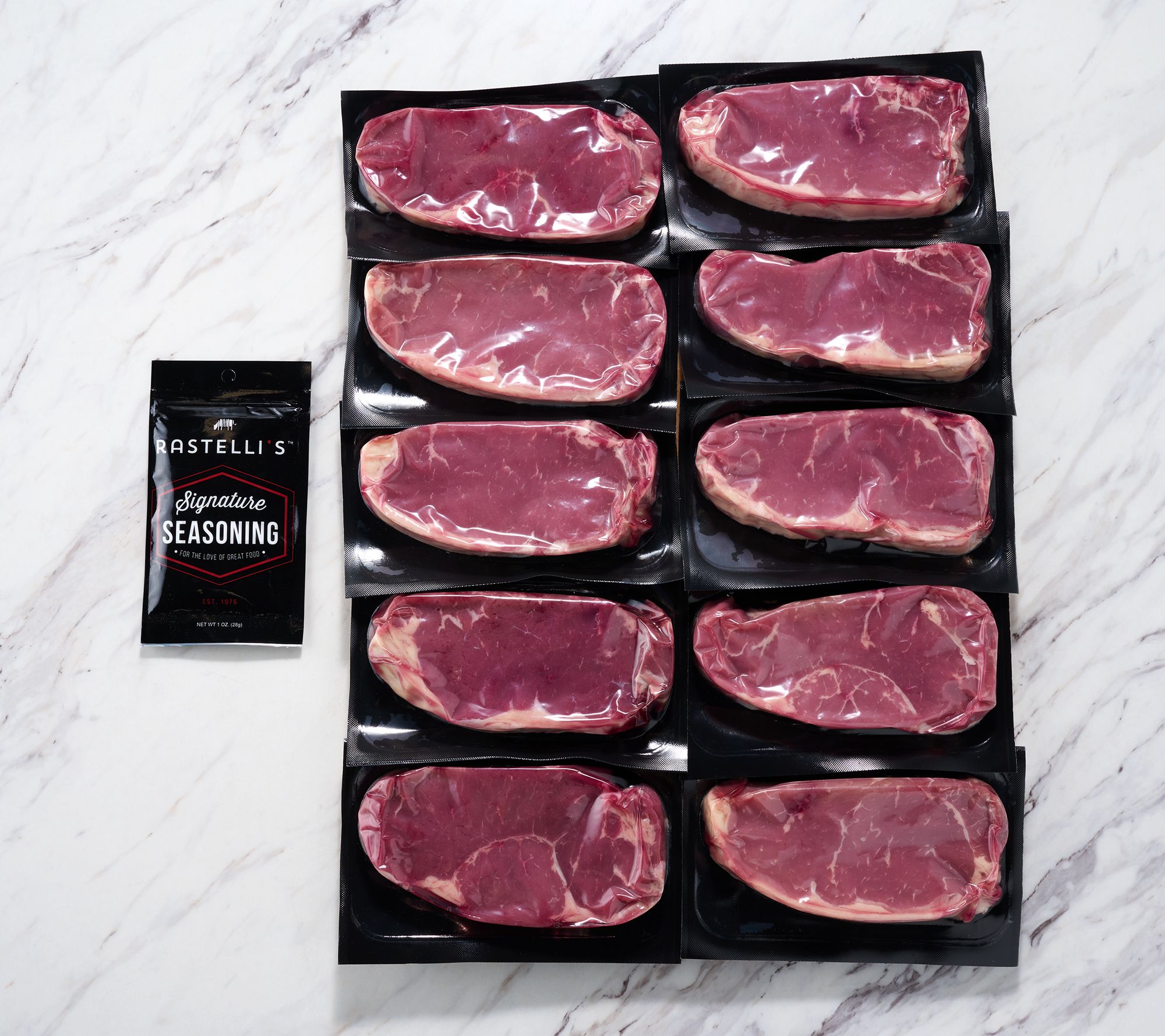 Includes 10 8-oz Black Angus NY Strip steaks and signature seasoning packet