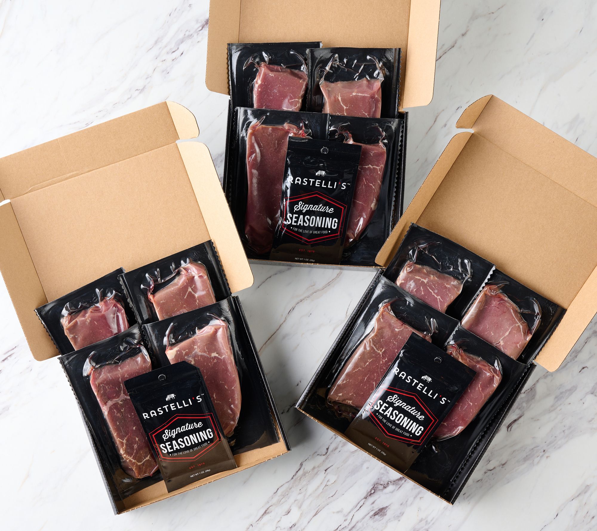 Includes 12 5-oz Black Angus sirloin steaks, three signature seasoning packets, and three gift boxes