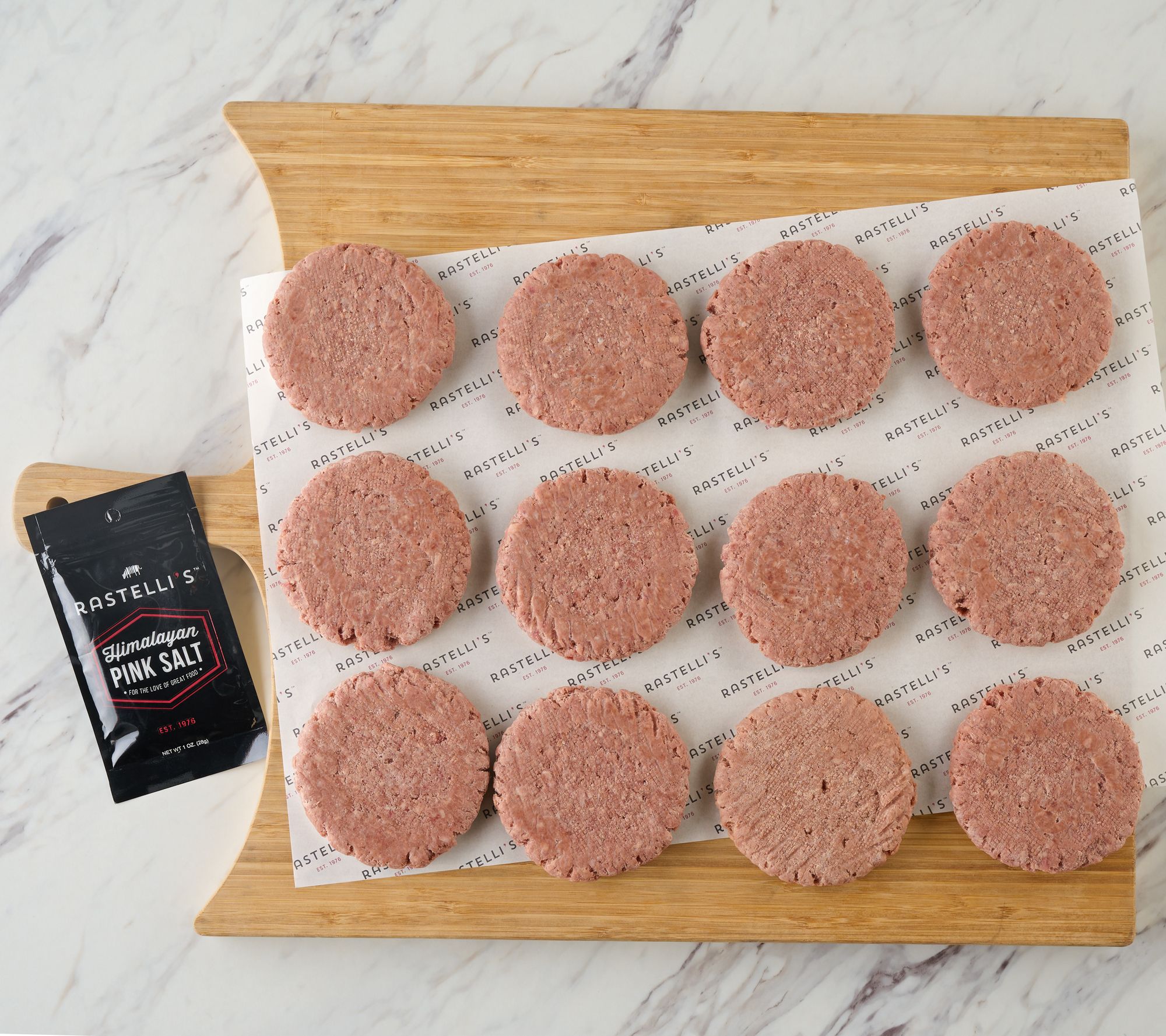 Includes 12 5.33-oz Private Stock steak burgers and 1-oz packet of Himalayan Pink Salt