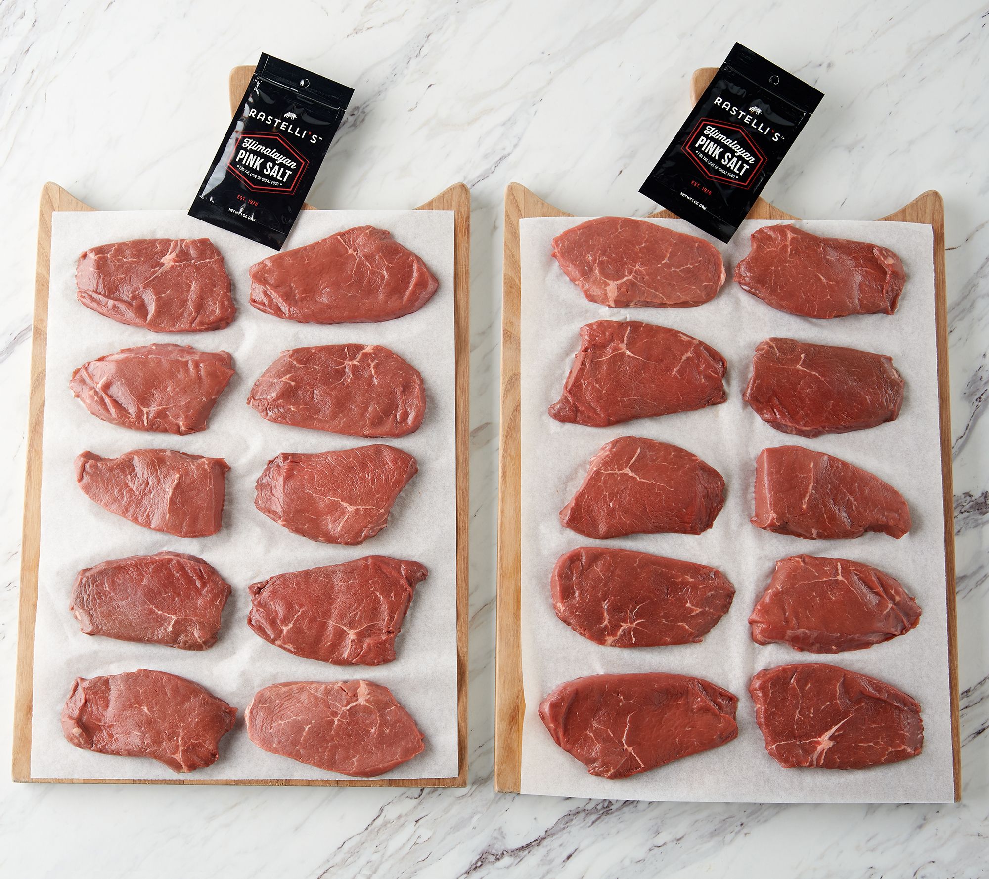 Includes 20 5-oz sirloin steaks and a packet of Rastelli's pink Himalayan sea salt