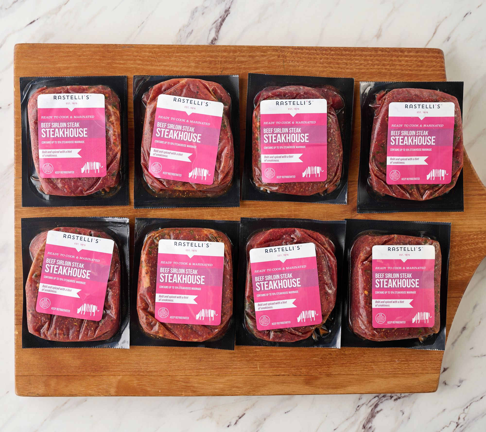 Includes eight 6-oz marinated Black Angus sirloin steaks