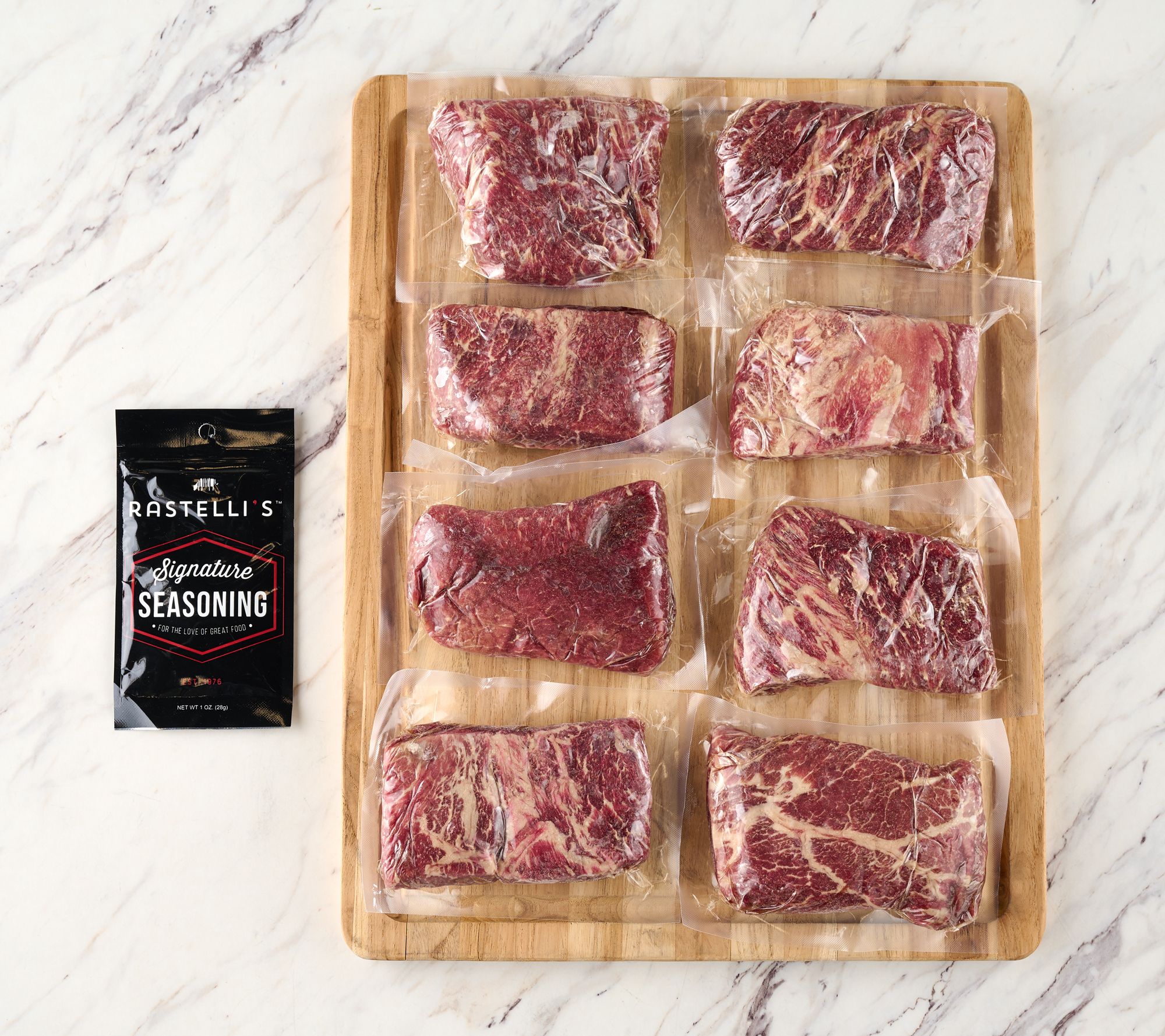 Includes eight 8-oz Reserve Butcher's Choice flat iron steaks and signature seasoning packet
