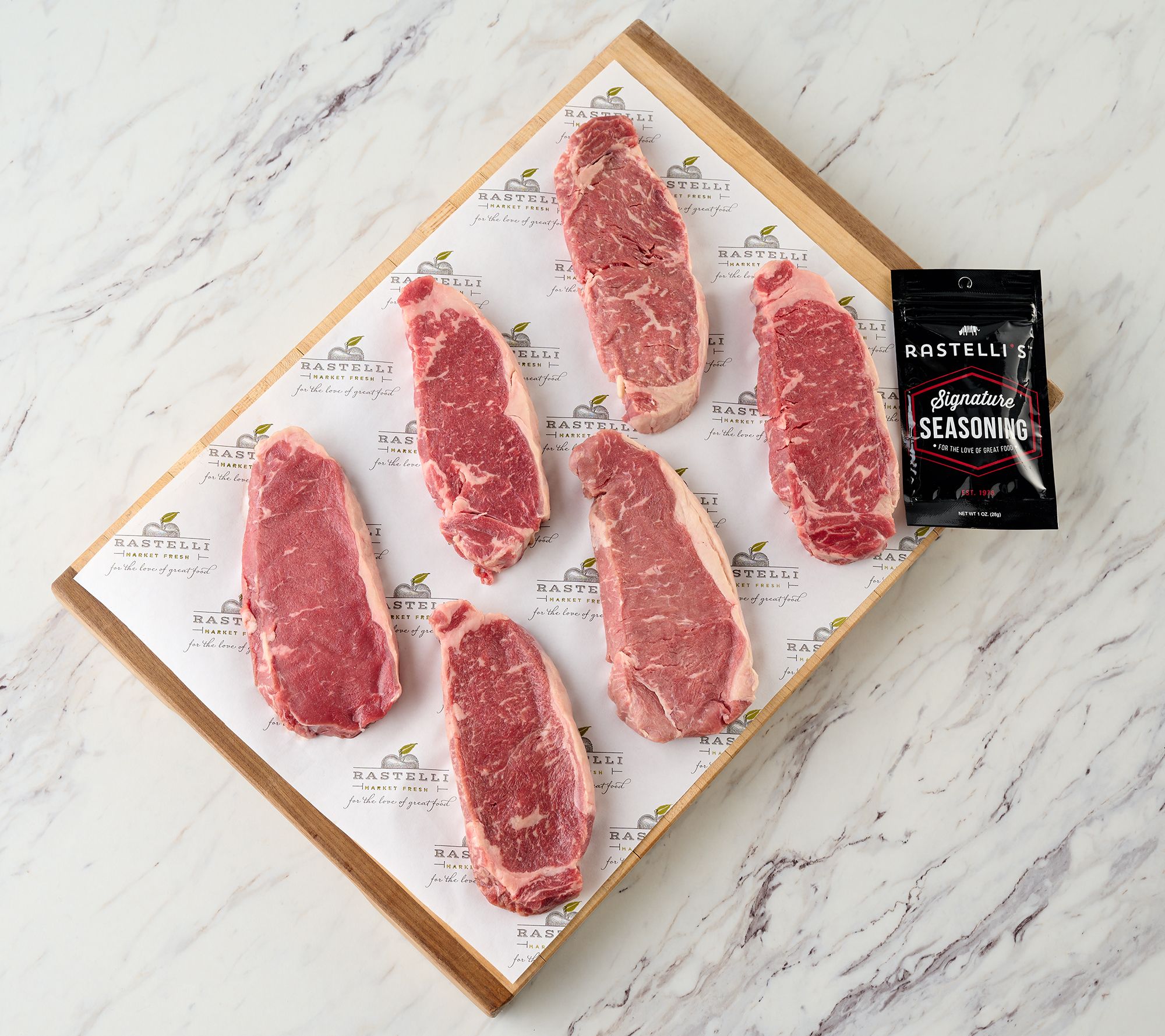 • Includes six 8-oz Black New York strip steaks and 1-oz Rastelli's Signature Seasoning