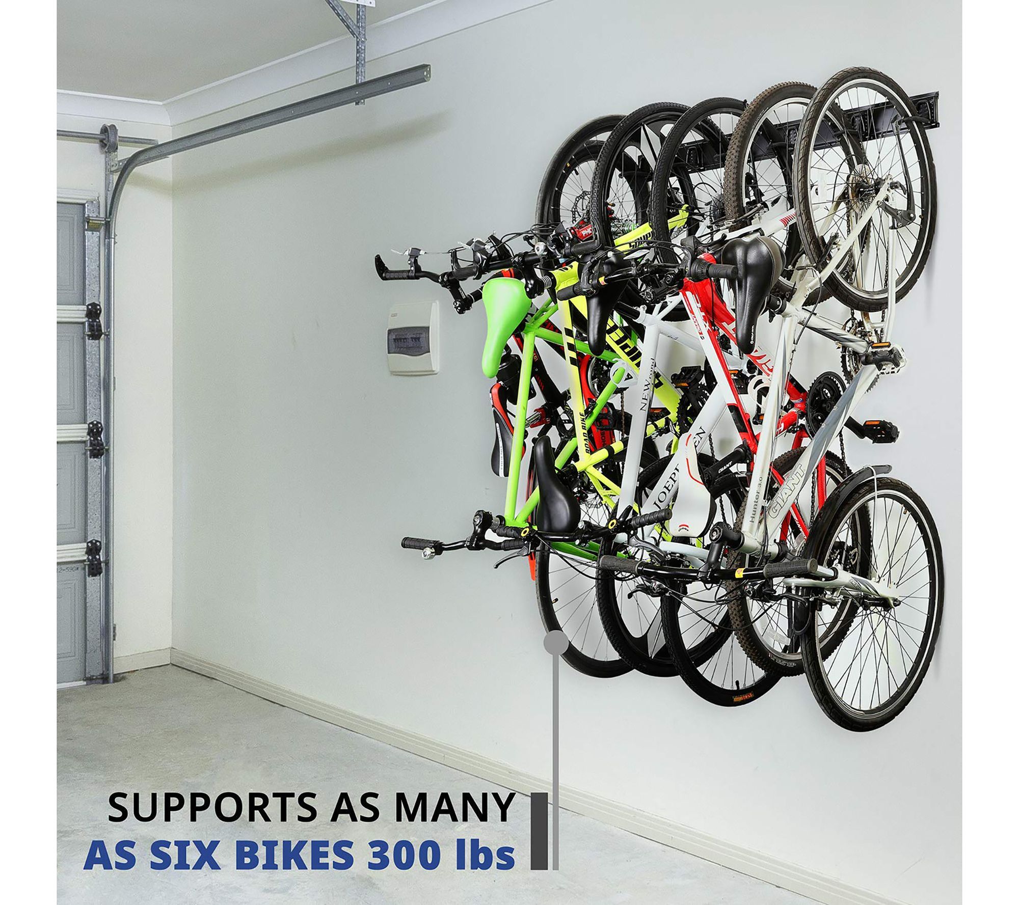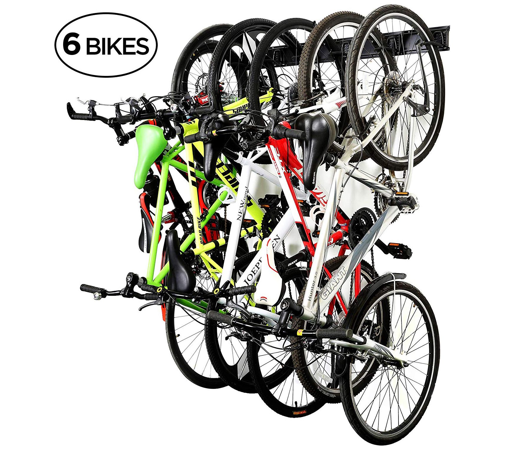 Save space and start stacking with this cleverly designed wall-mounted multi bike rack that holds up to 6 bikes. Featuring durable, solid steel construction and heavy-duty shock-resistant hangers, this rack features adjustable, anti-scratch hooks that help prevent chipped paint and scratches. Regain use of your garage when your family's bikes are neatly on this rack on the wall. All you add are bikes. From RaxGo.