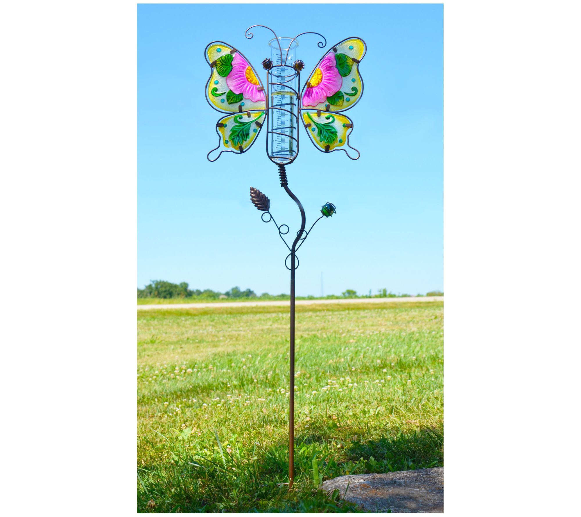 Measure your rainfall with this colorful and charming, rustic butterfly rain gauge with a leaf and glass ball accent. The solid glass gauge tube measures up to 7" of water. It comes with an h-shaped bottom stake to secure it into the ground. From Red Carpet Studios.