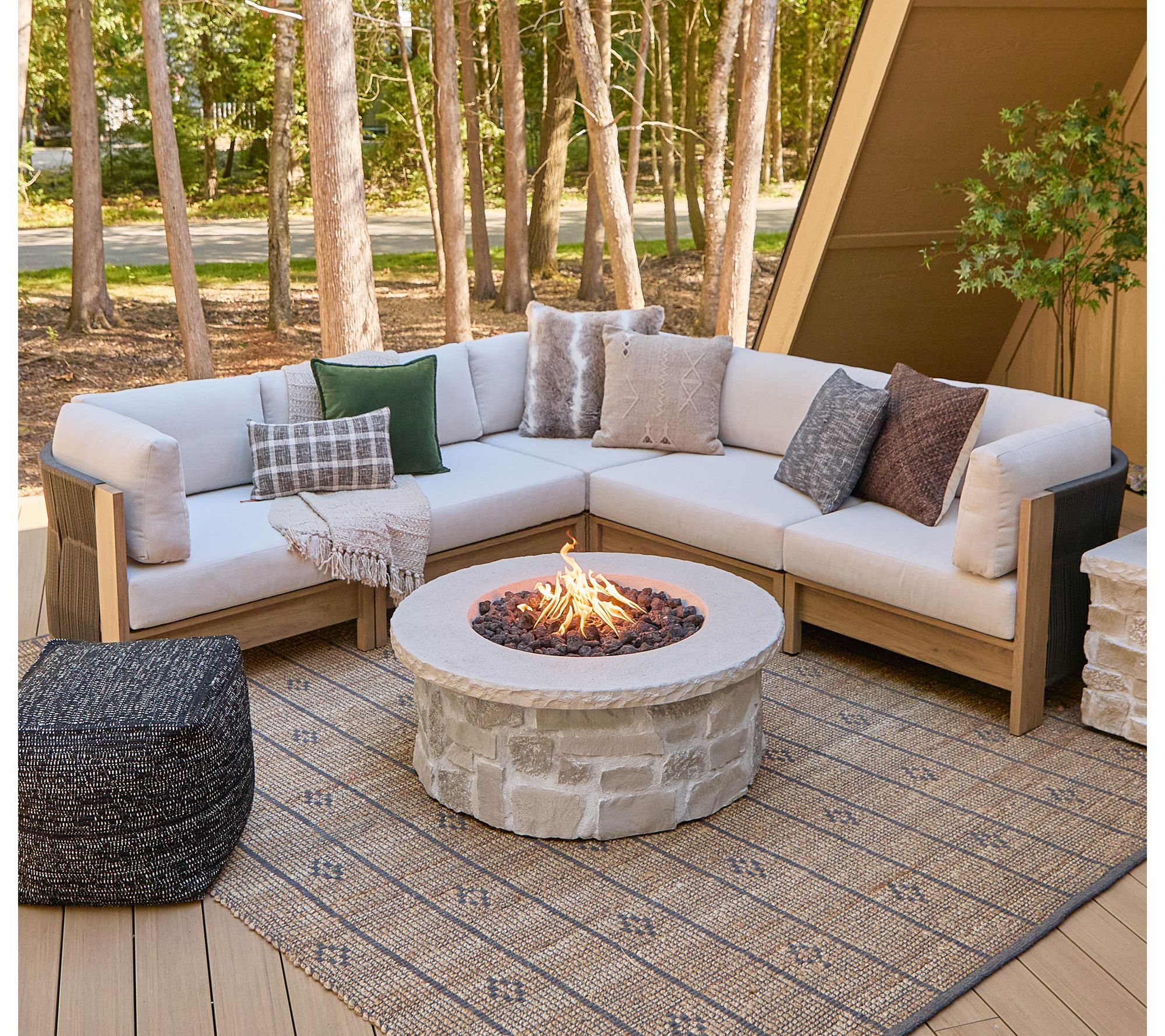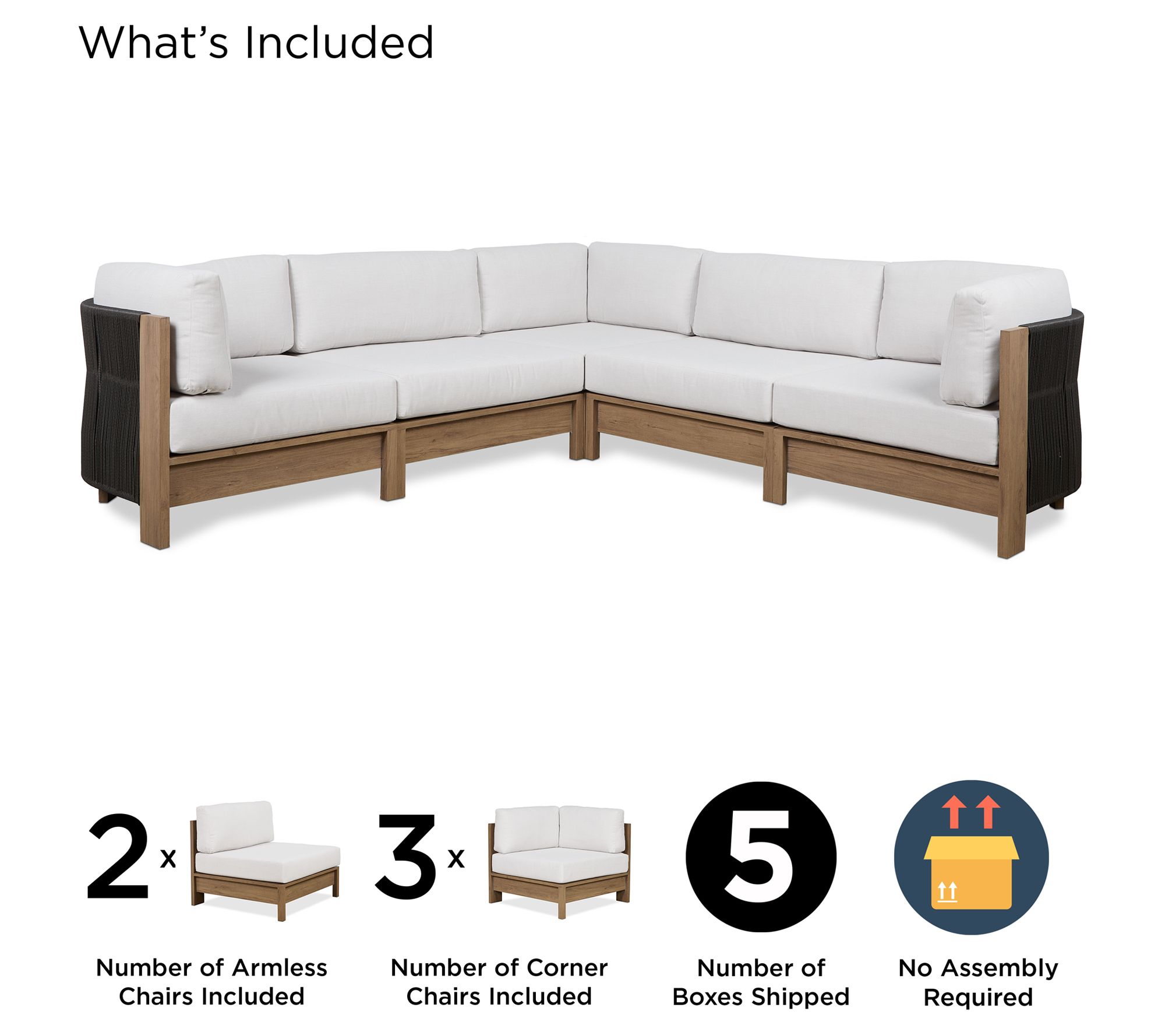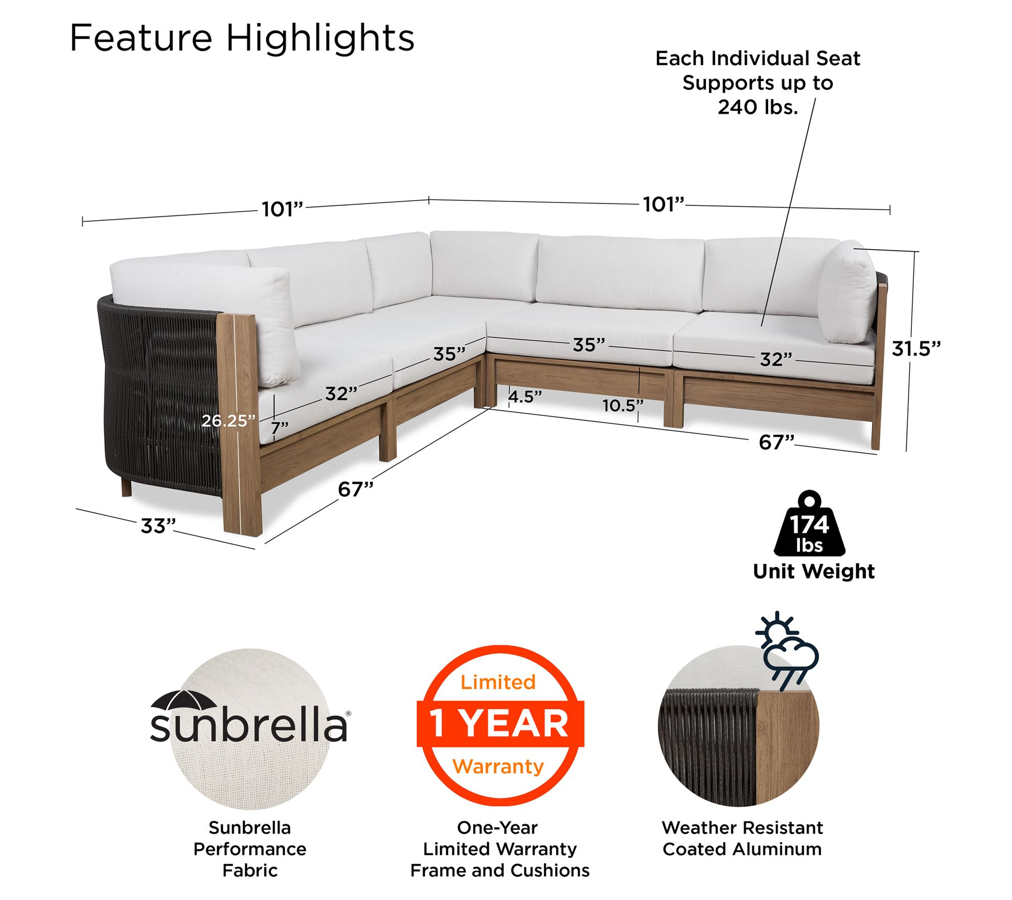 Imagine a cozy gathering with family or friends on this modular outdoor sectional. Arrange the five pieces to your liking and enjoy durable comfort with an aluminum frame designed to mimic natural wood, and Sunbrella cushions for a weather-resistant, easy-to-maintain seating area. Perfect for any patio setting, itâs all about relaxed elegance and versatility. From Real Flame.
