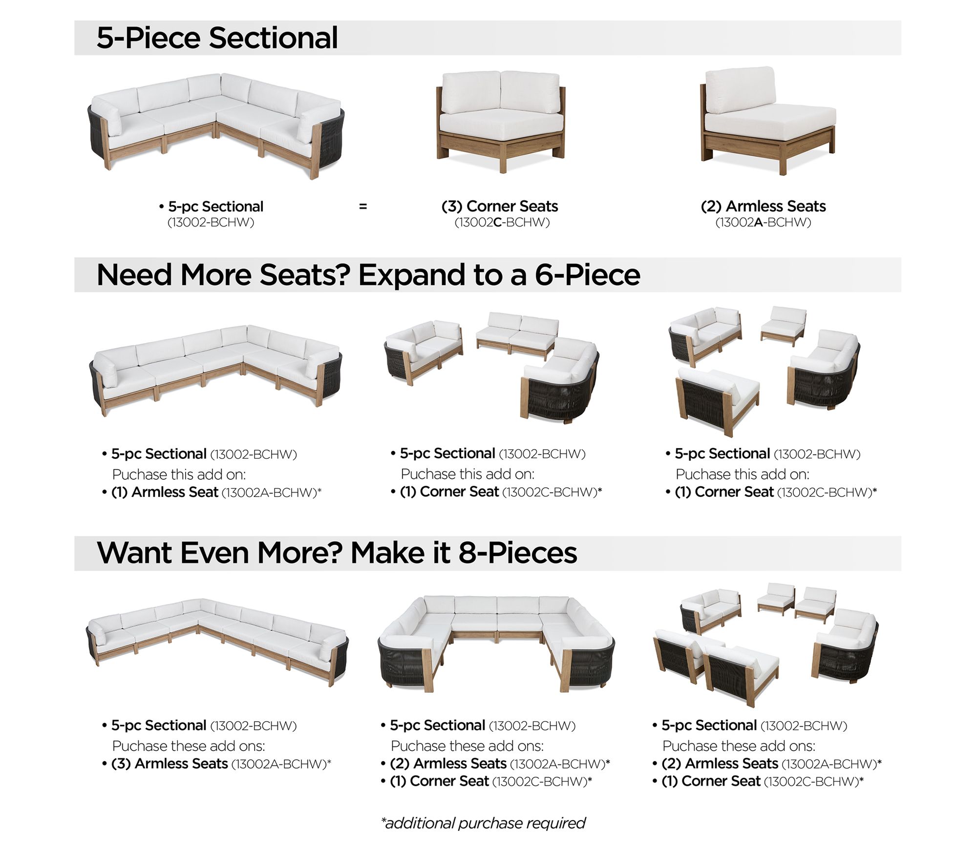 Includes two fully assembled armless chairs with leveling feet, each with one seat cushion, one back cushion, and two chair clamps, and three fully assembled corner chairs with leveling feet, each with one seat cushion, two back cushions, and two clamps
