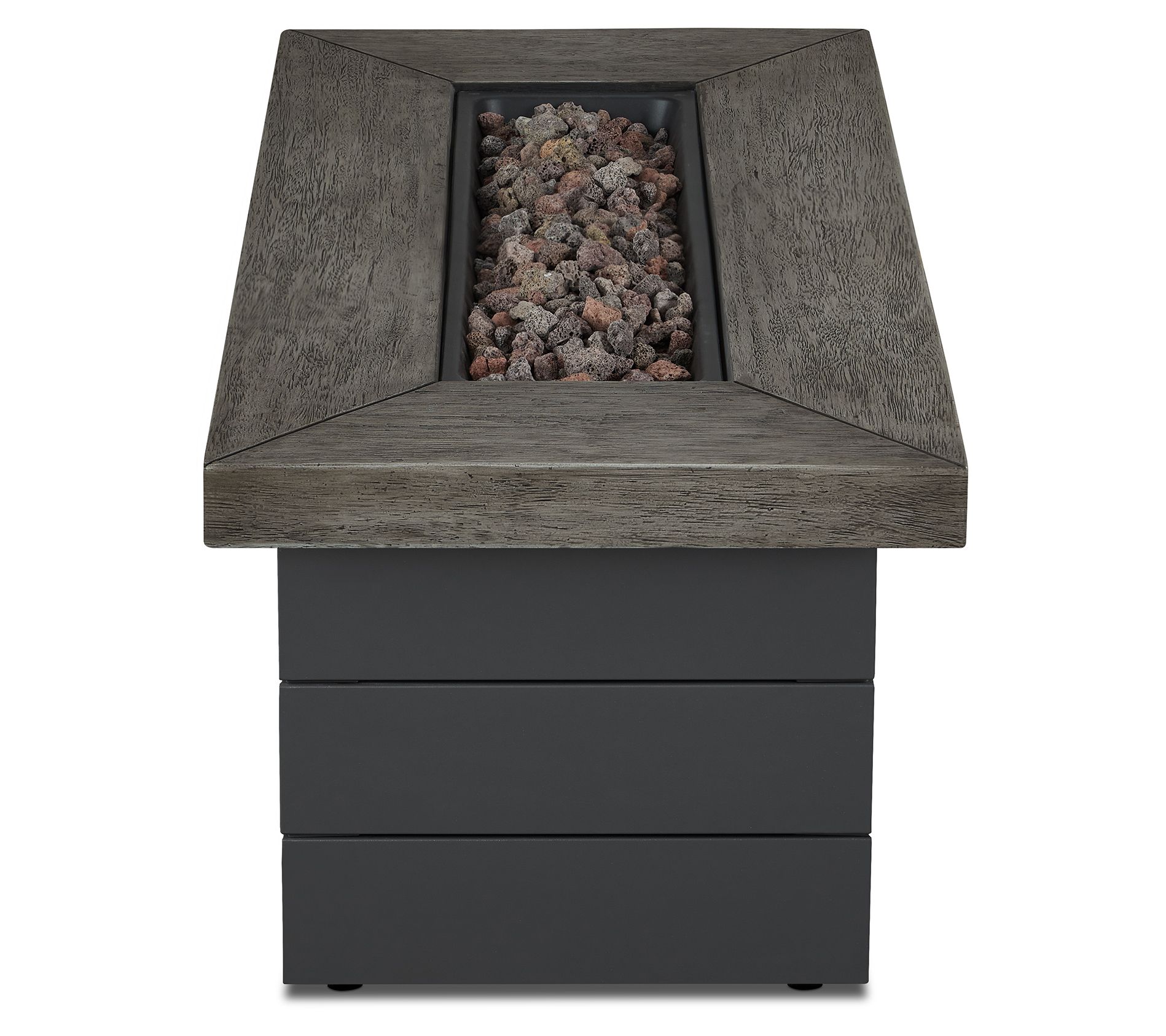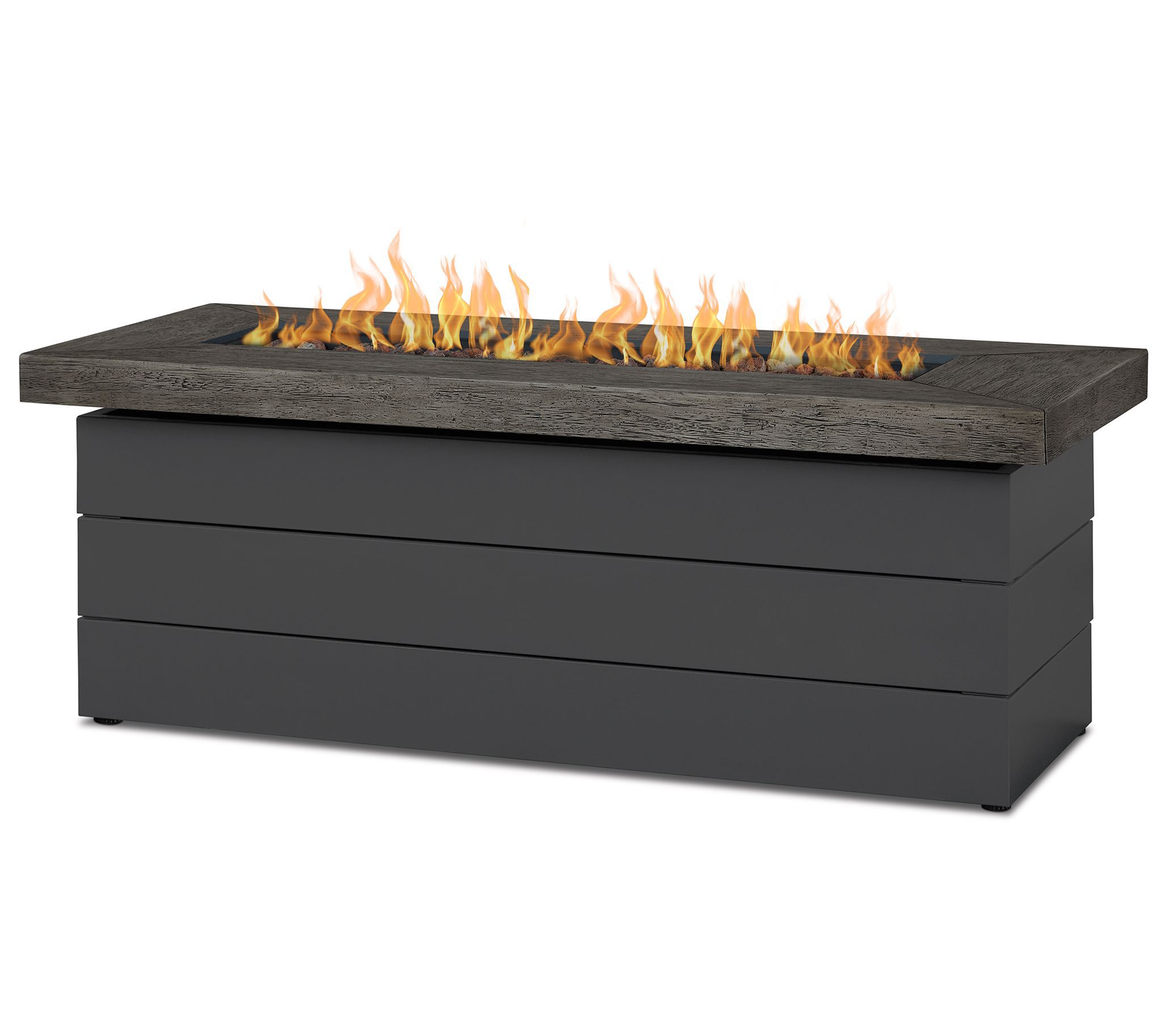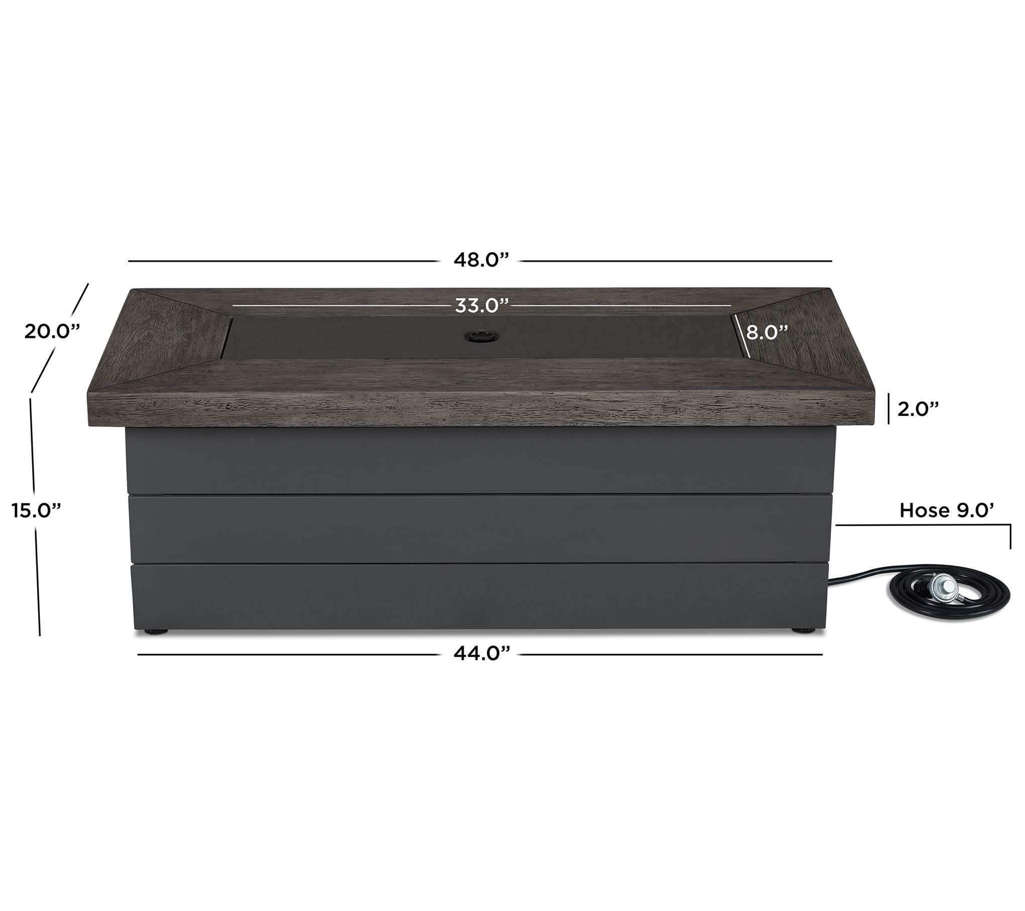 • Includes fire table with leveling feet, linear burner, burner lid, rust lava rock, tank seat, LP hose and regulator, and 1 AAA battery