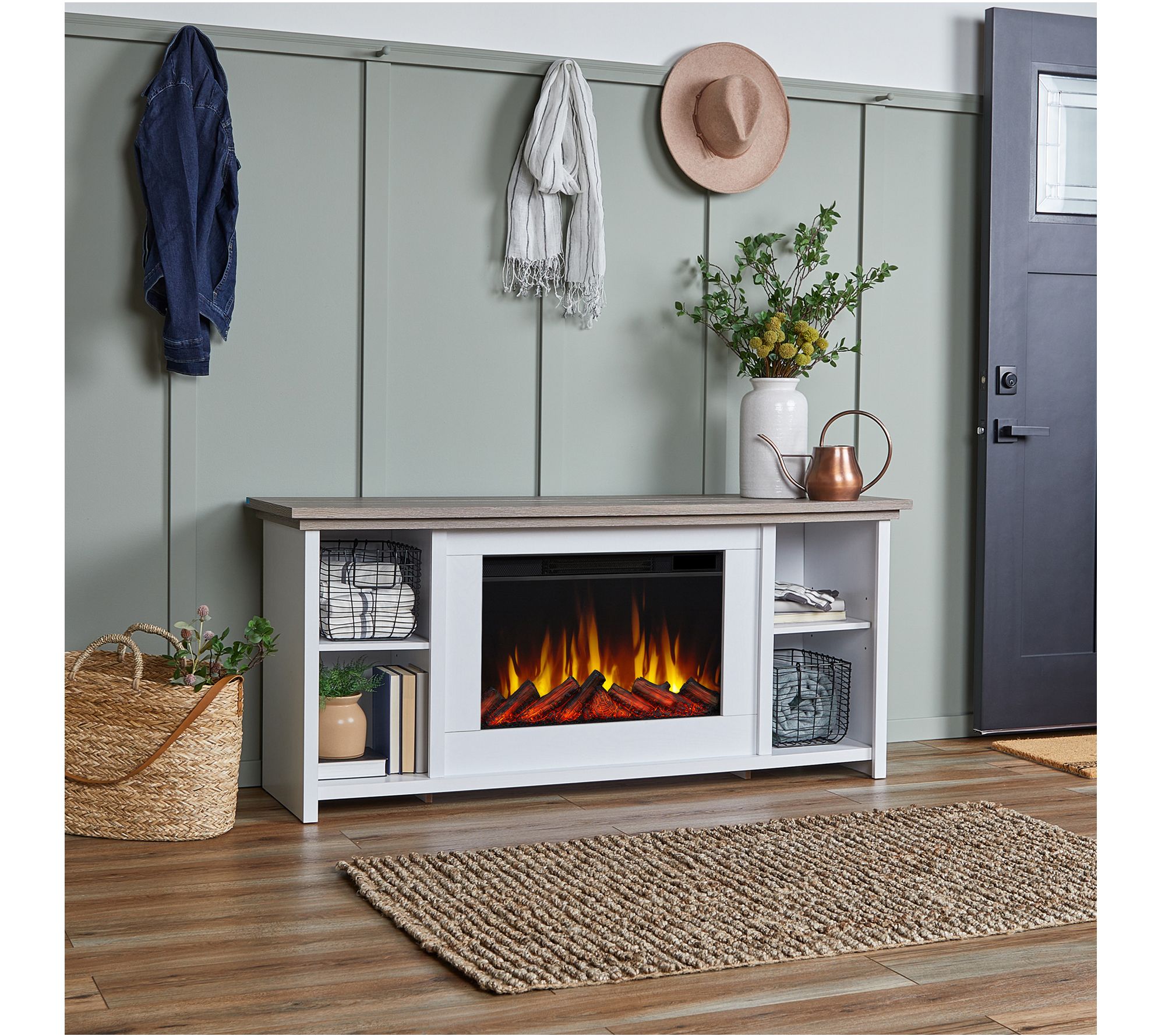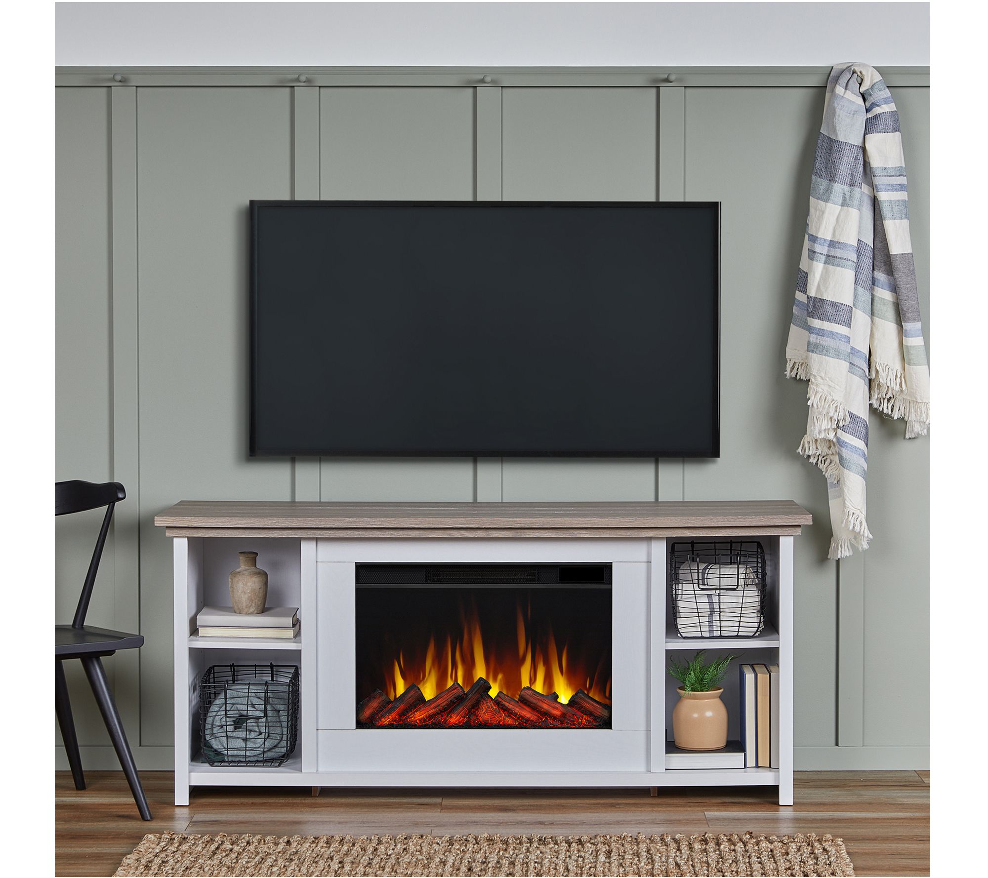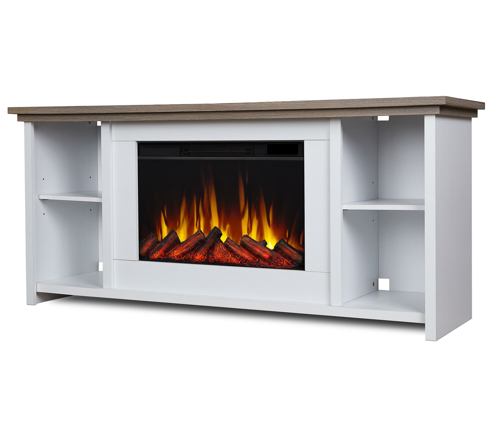 Stay cozy on chilly nights with this electric fireplace featuring a realistic-looking flickering flame without the need for a chimney. It adds contemporary beauty and warm ambiance to your space, while also providing a handsome spot to house your television. From Real Flame.
