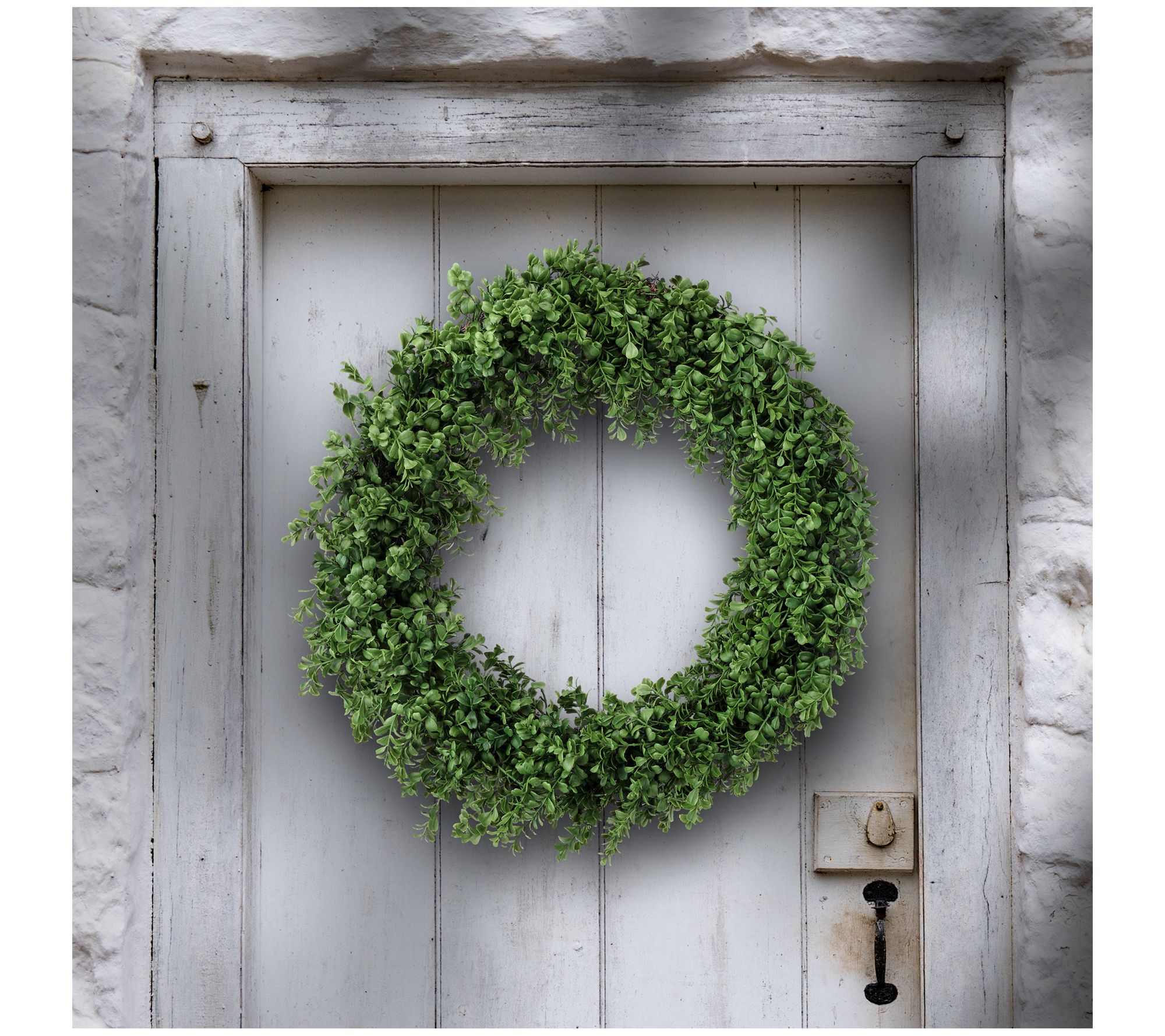 Bring elegant seasonal beauty to your door with this intricate boxwood wreath crafted in lush, realistic detail. From Valerie Parr Hill.