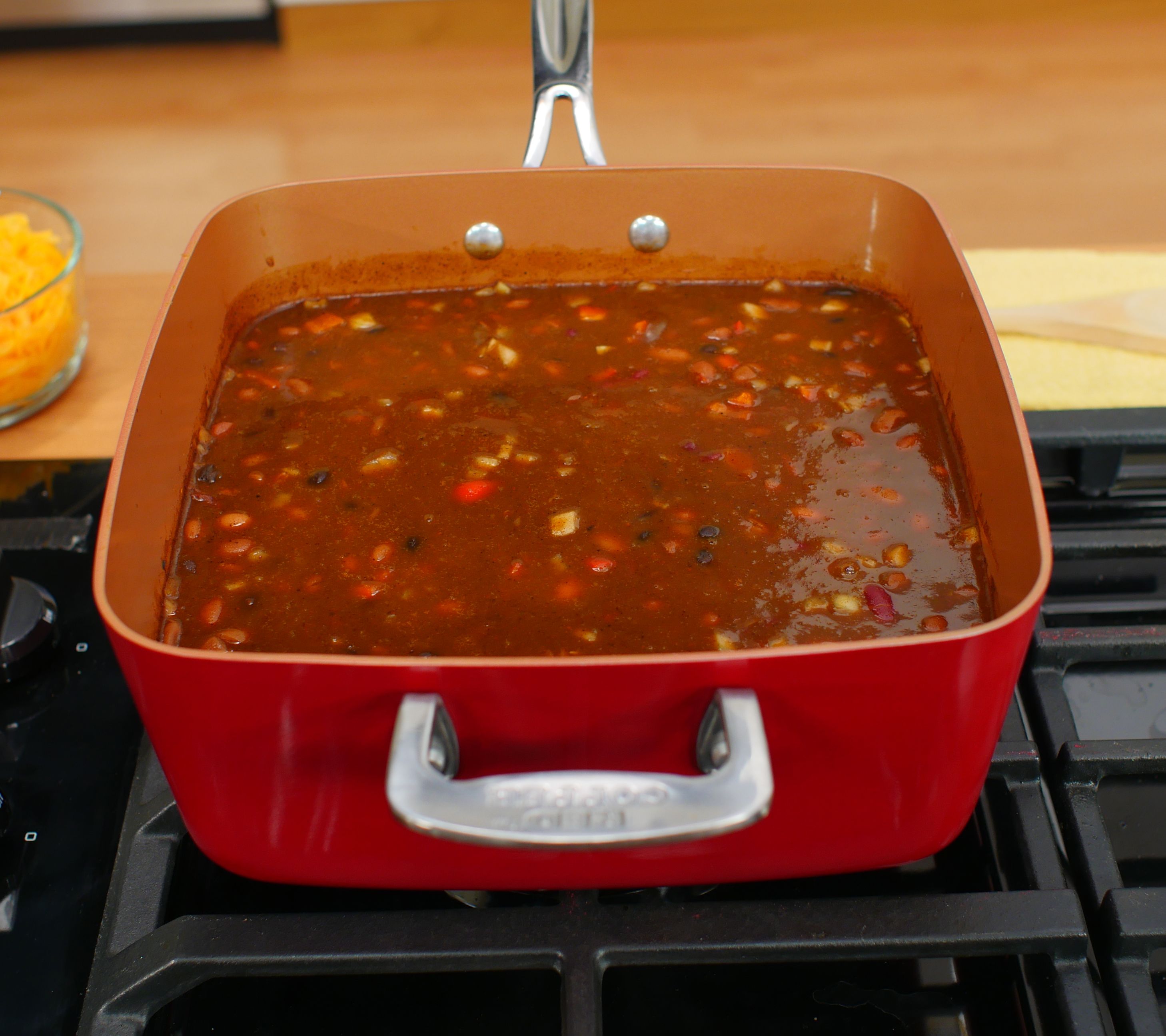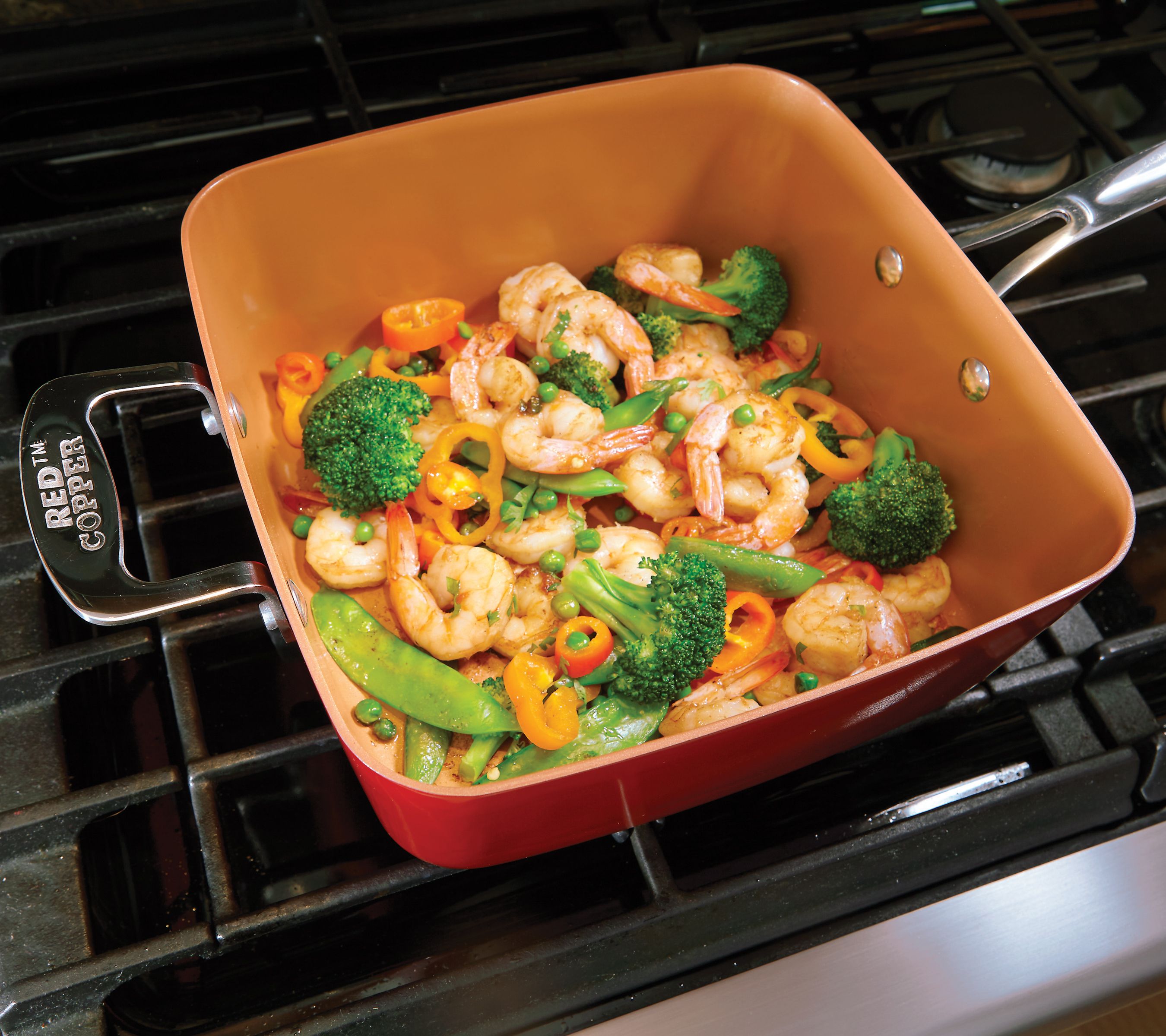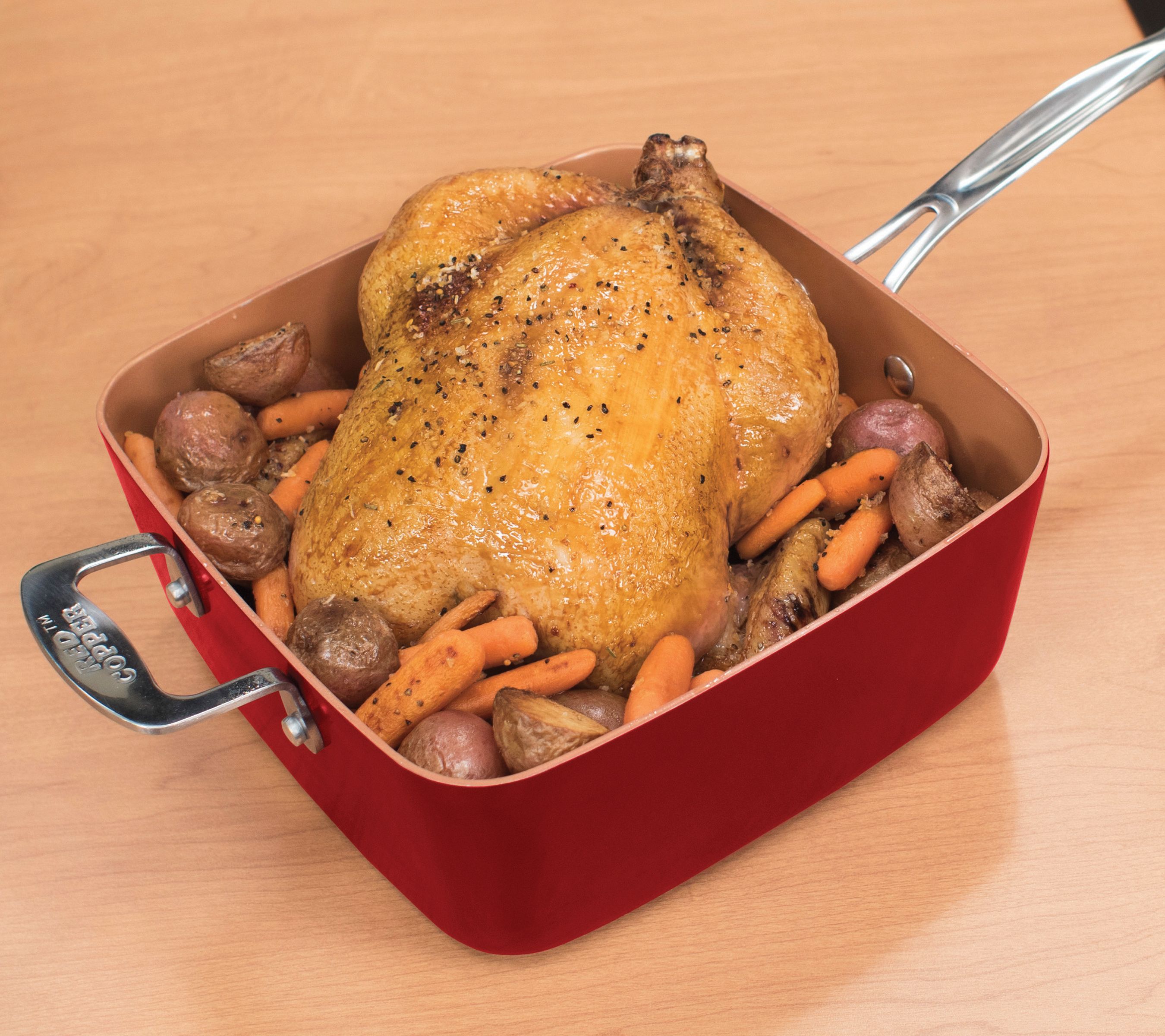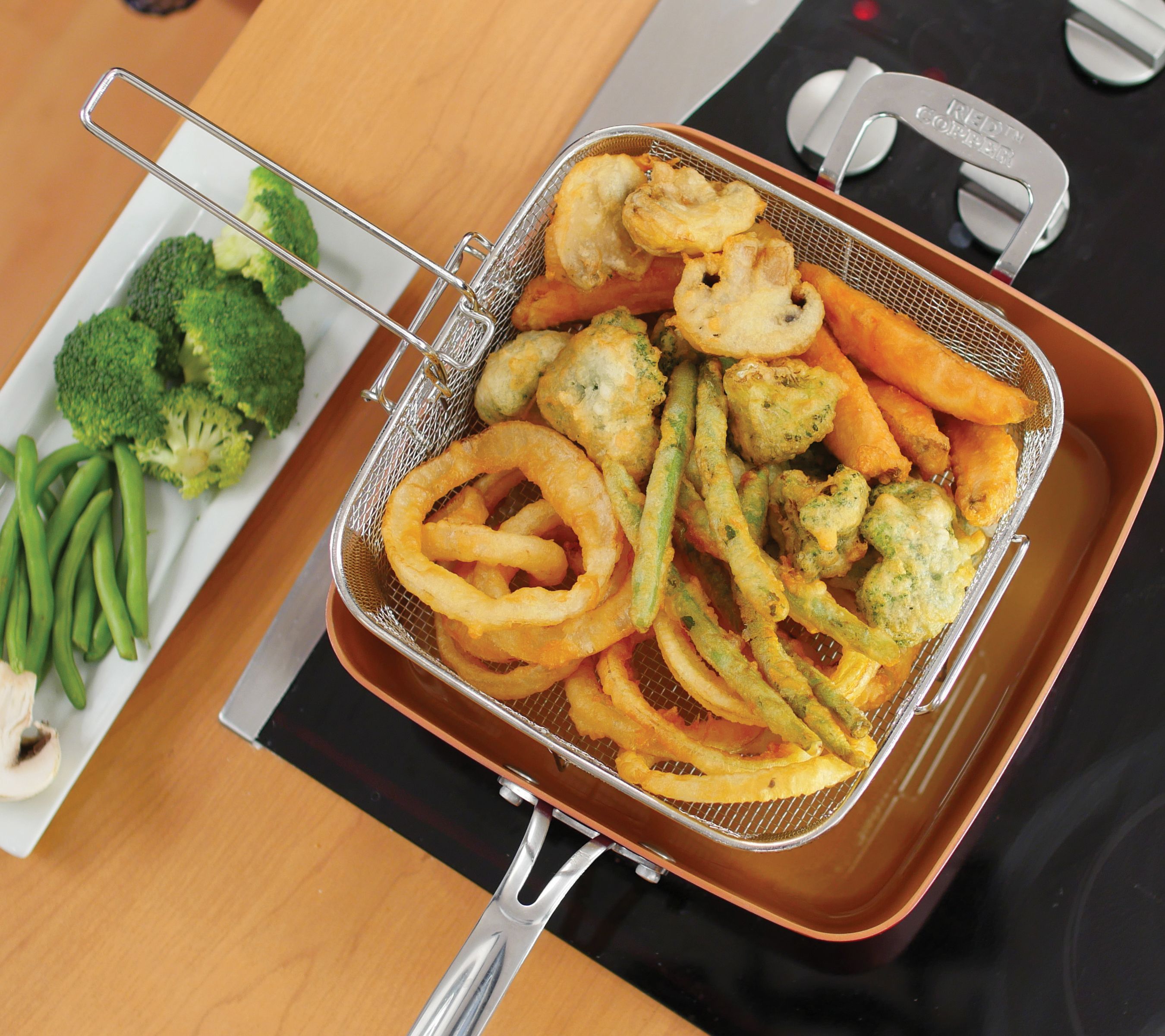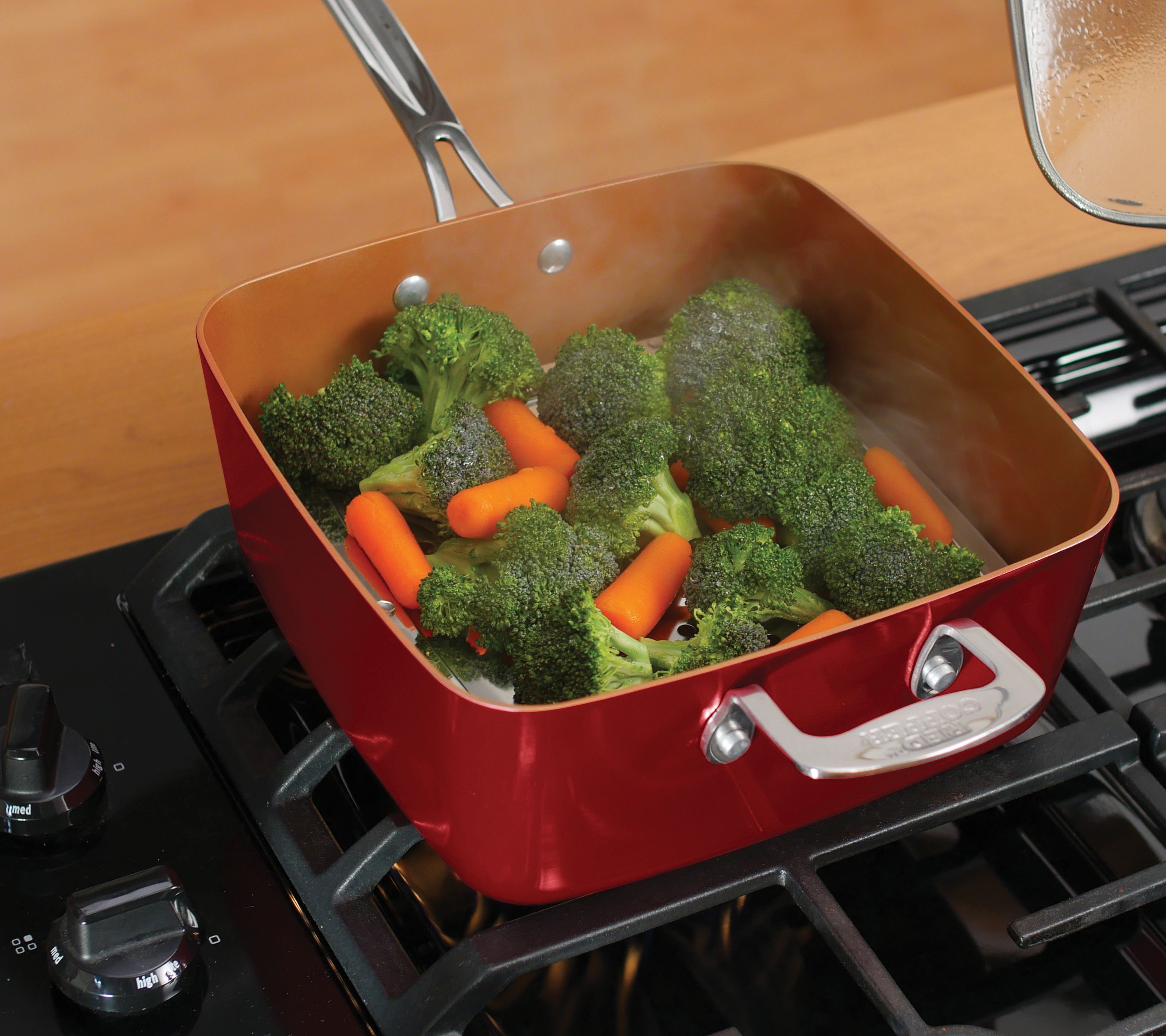 • Includes 4.5-qt square pan, tempered glass lid, steamer rack, square frying basket, and Red Copper recipe guide