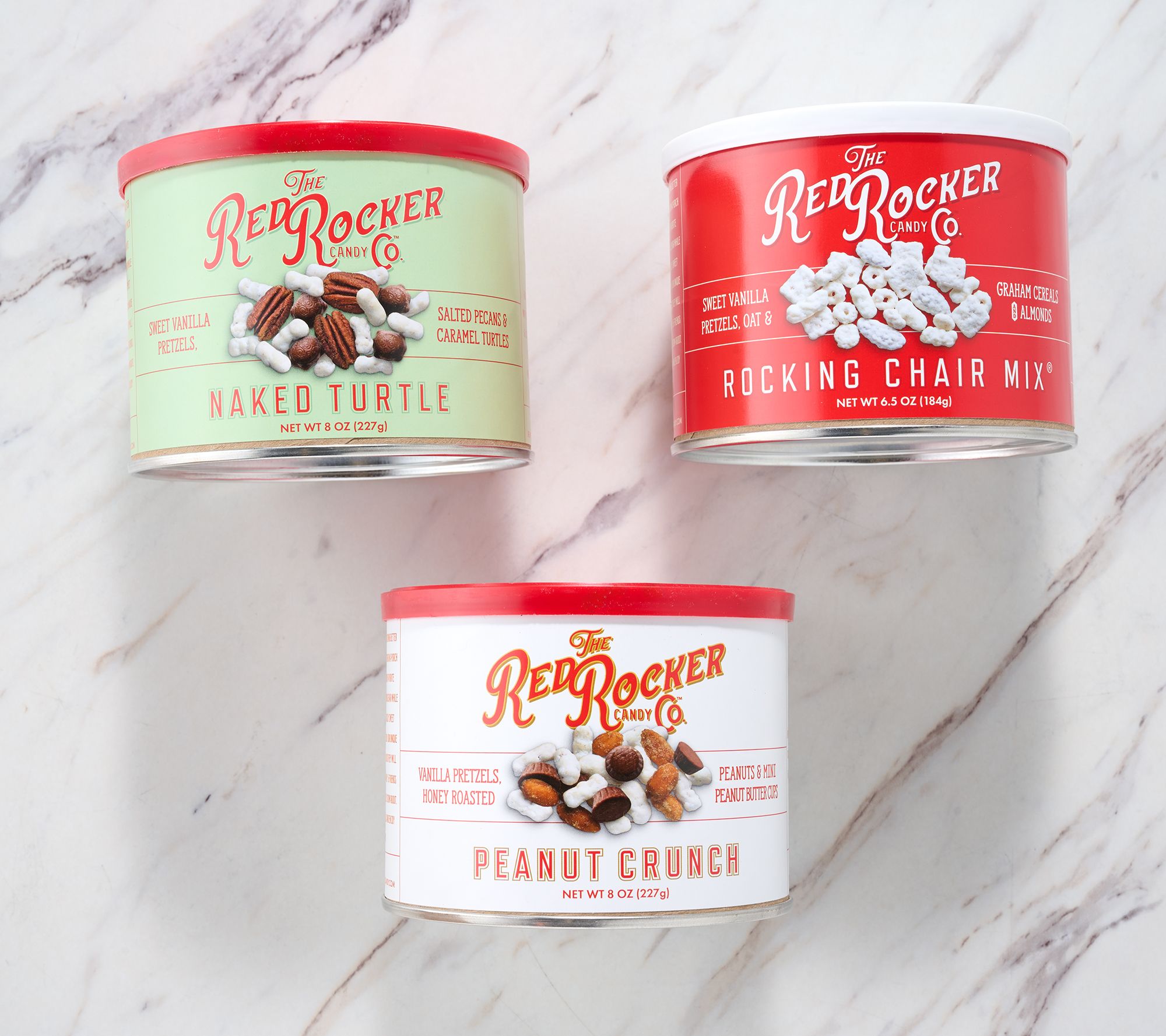 Craving something sweet and unexpected for your next movie night or holiday get-together? This trio of snack mixes delivers bold flavor in tidy tins, ready for gifting or sharing. Enjoy crunchy bites of candied pretzels in Rocking Chair Mix, Peanut Crunch, and Naked Turtle pieces that put a creative spin on classic treats. From Red Rocker Candy.