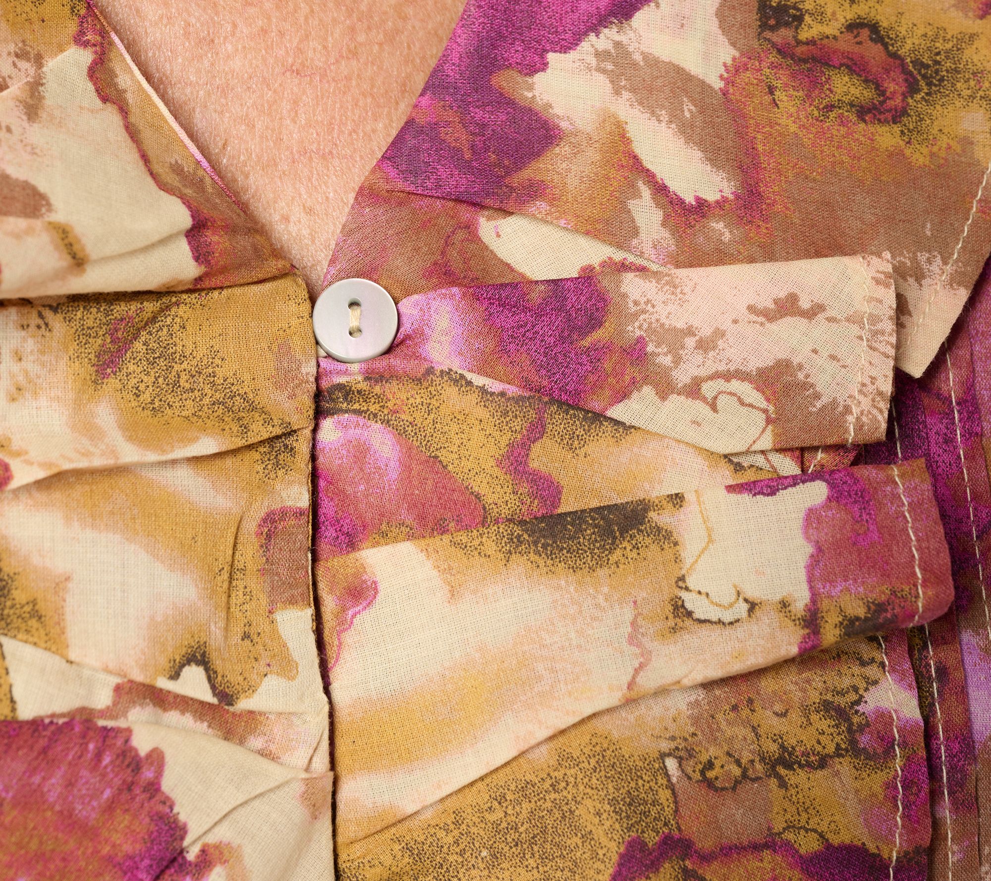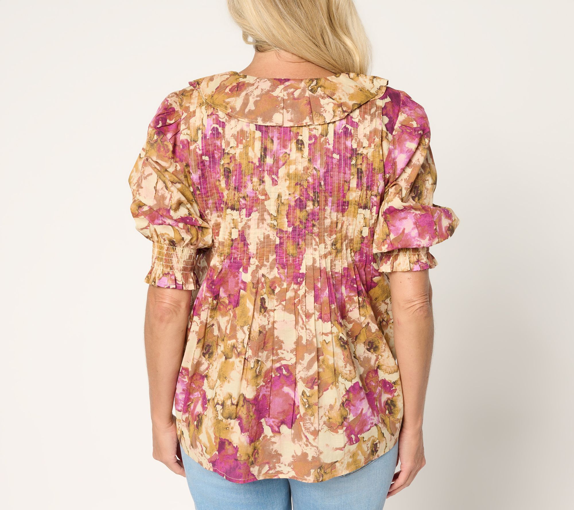 Features: below-elbow-length sleeves with smocking detail, V-neckline with front ruffle detail, straight bottom hem, allover print, functional buttons with self loops, pintucks across front and back yoke