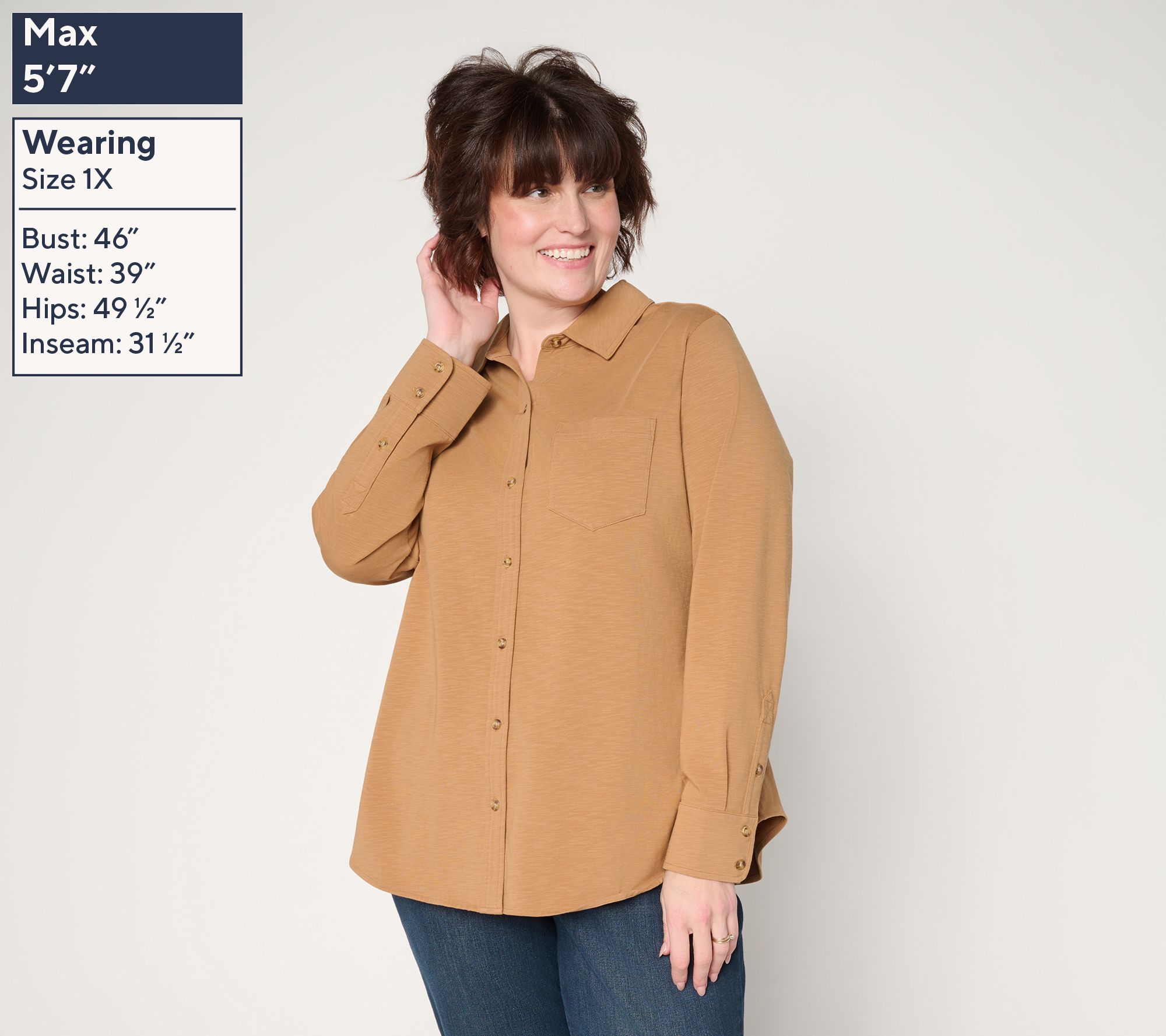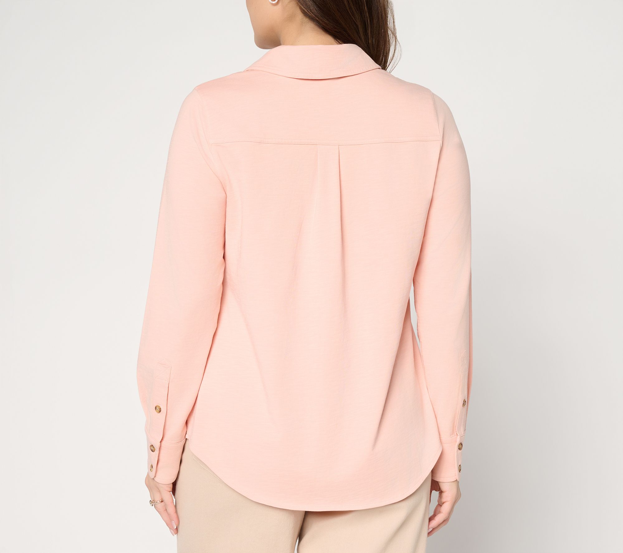 Features: stand collar, button-front placket, single chest pocket, long sleeves withbutton cuff placket, back yoke with pleat, shirttail hem