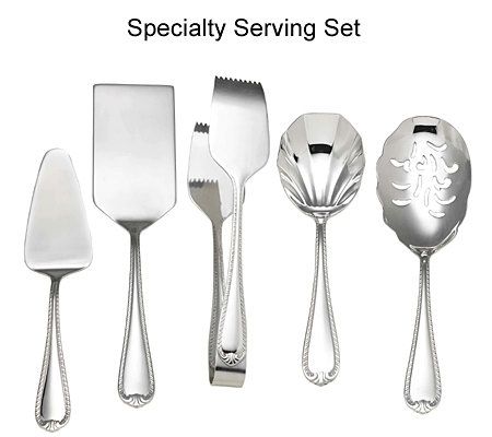 five specialty serving pieces: pie, lasagna, and macaroni servers; all-purpose tongs; berry/dessert spoon