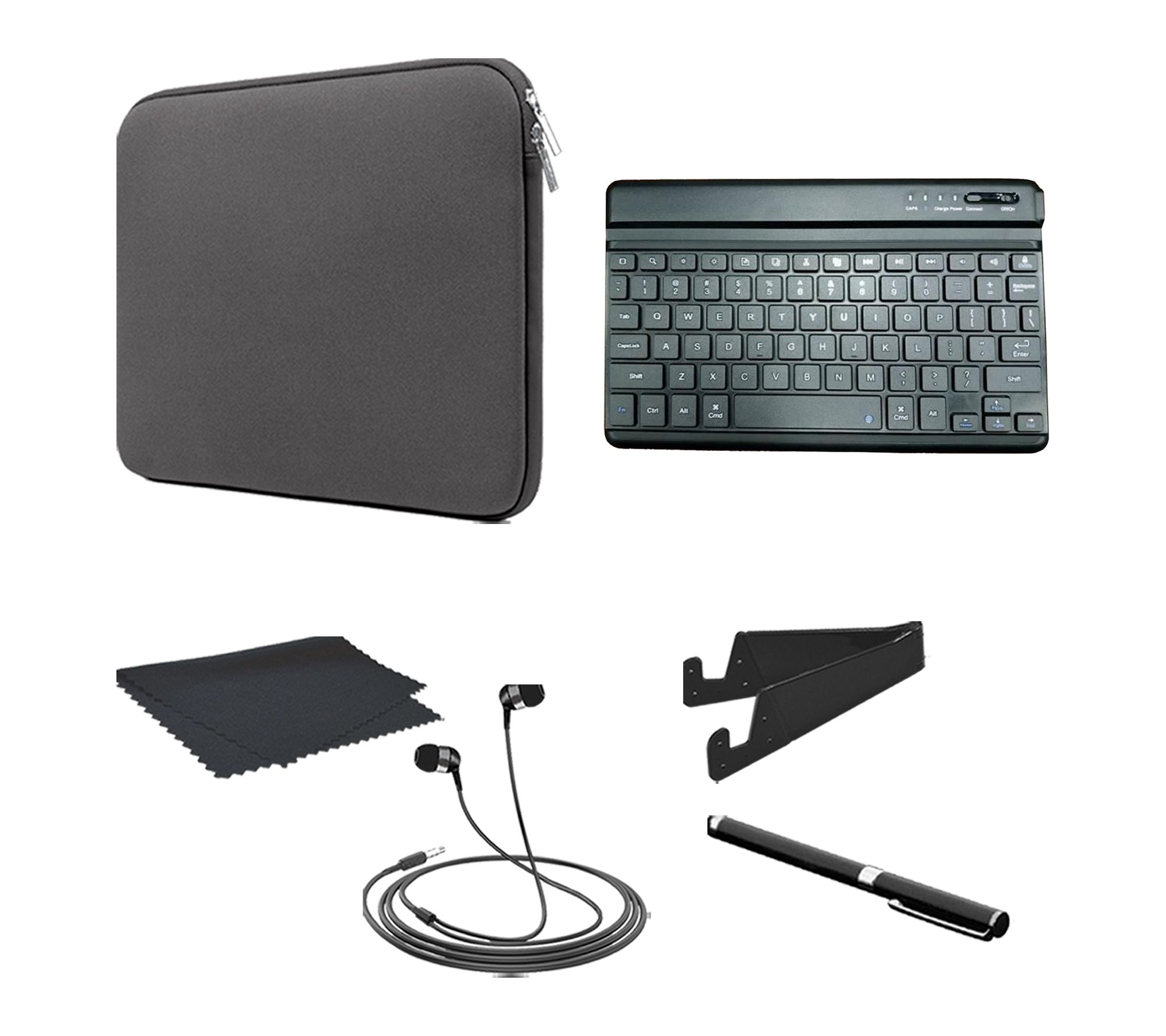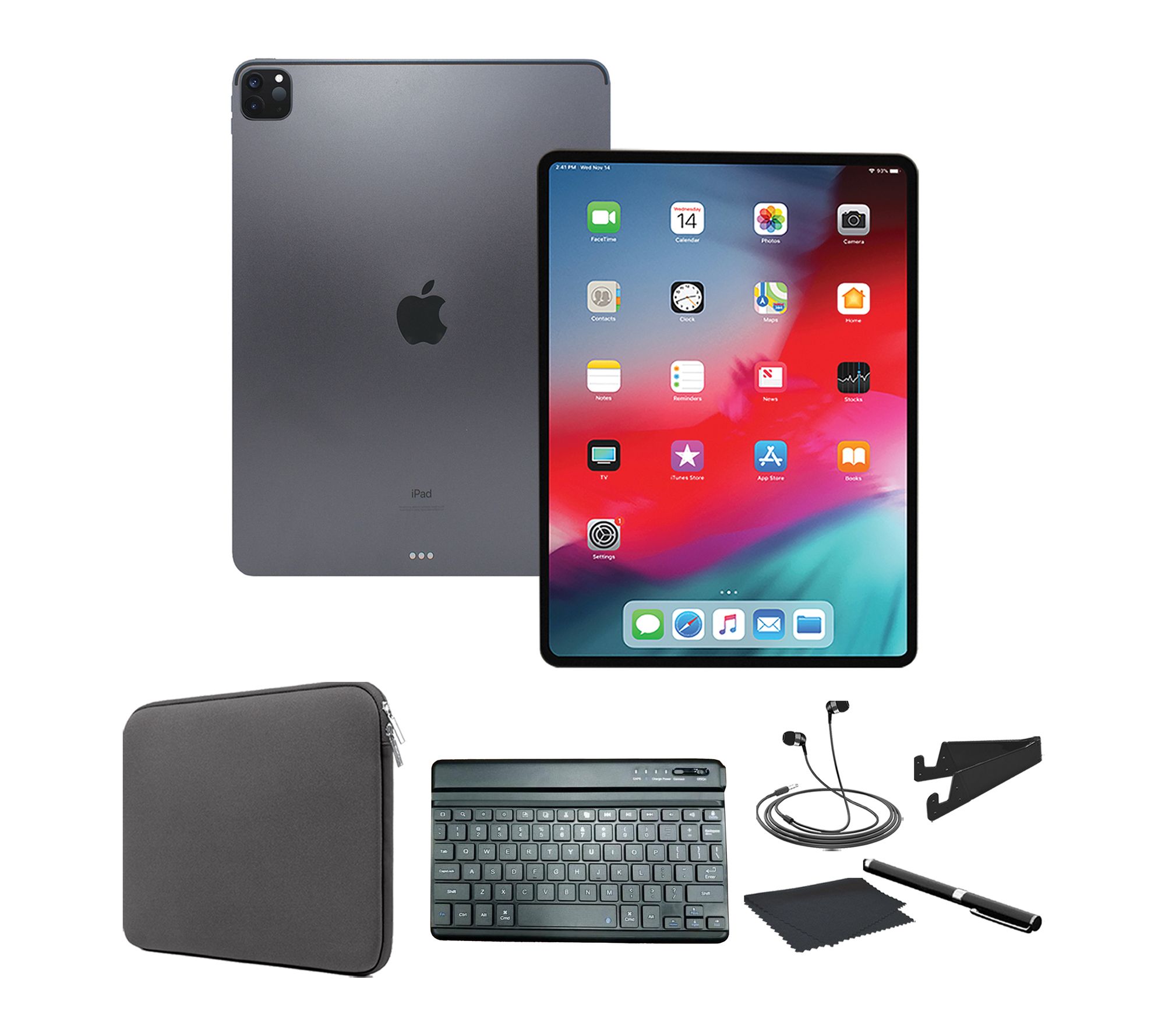 Includes refurbished iPad Pro, USB-C charge cable (1 meter), and 18W USB-C power adapter; carry case, wireless keyboard, stand, stylus, cleaning cloth, and wired earbuds
