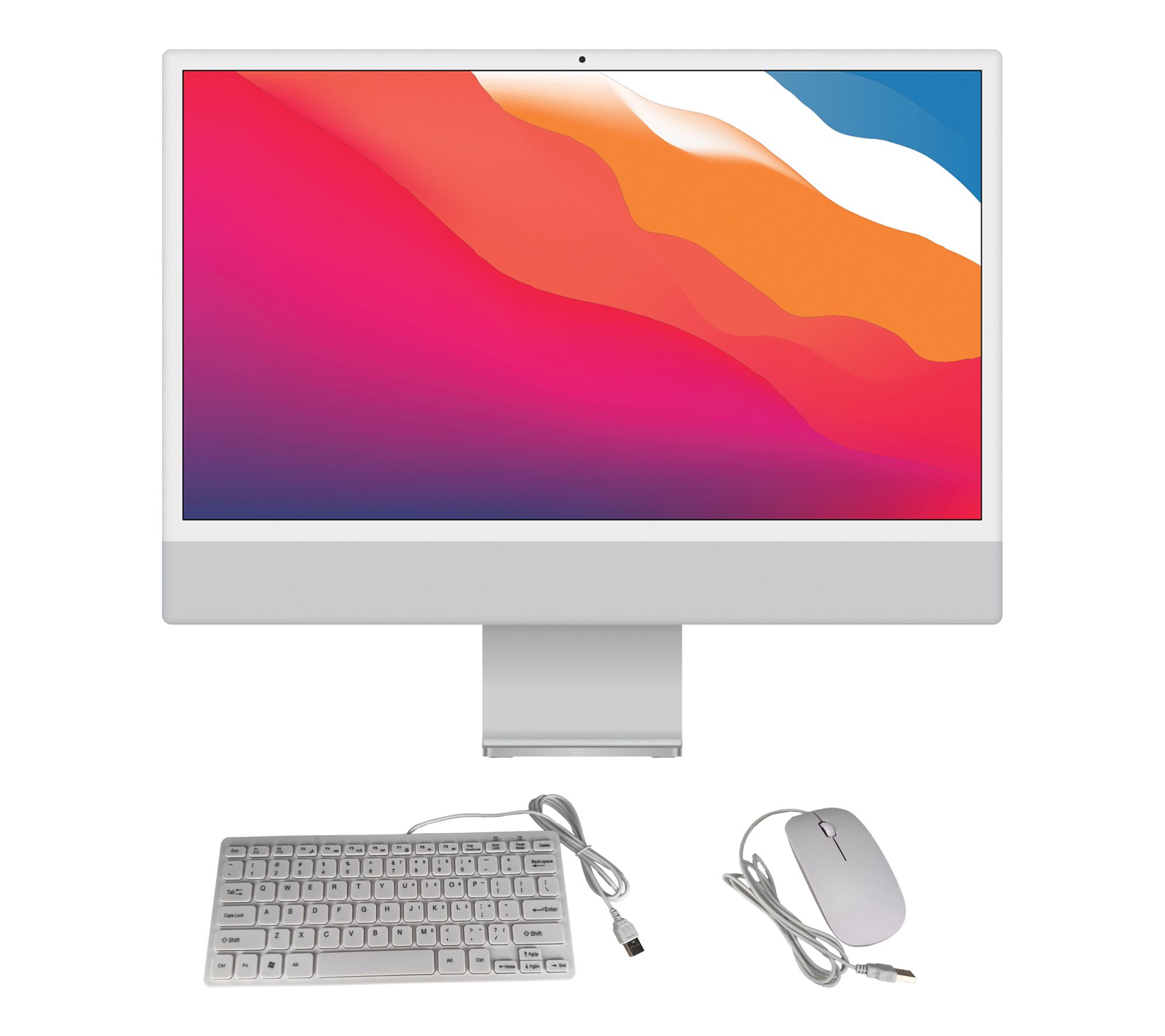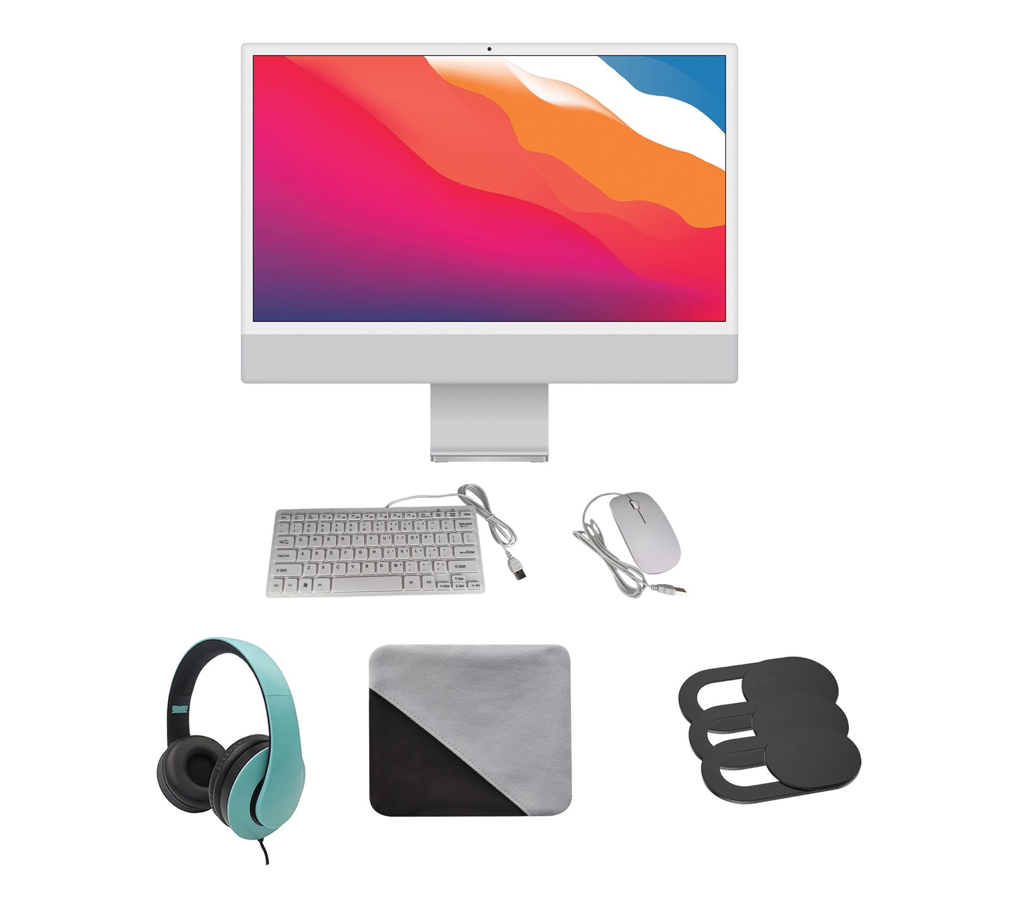 Includes refurbished Apple 24" iMac with wired keyboard, mouse, power adapter, power cord, USB Type-C to Lightning cable, wired headphones, cleaning cloth, and three-pack webcam cover