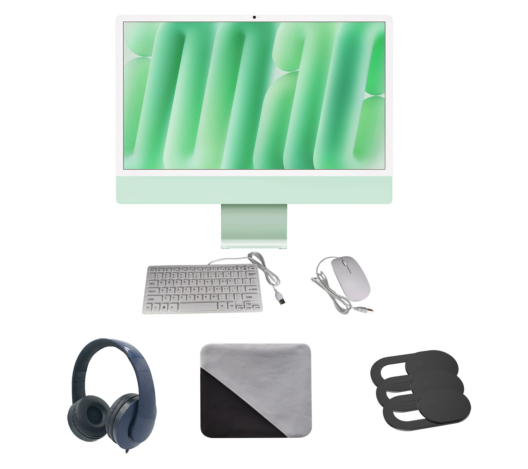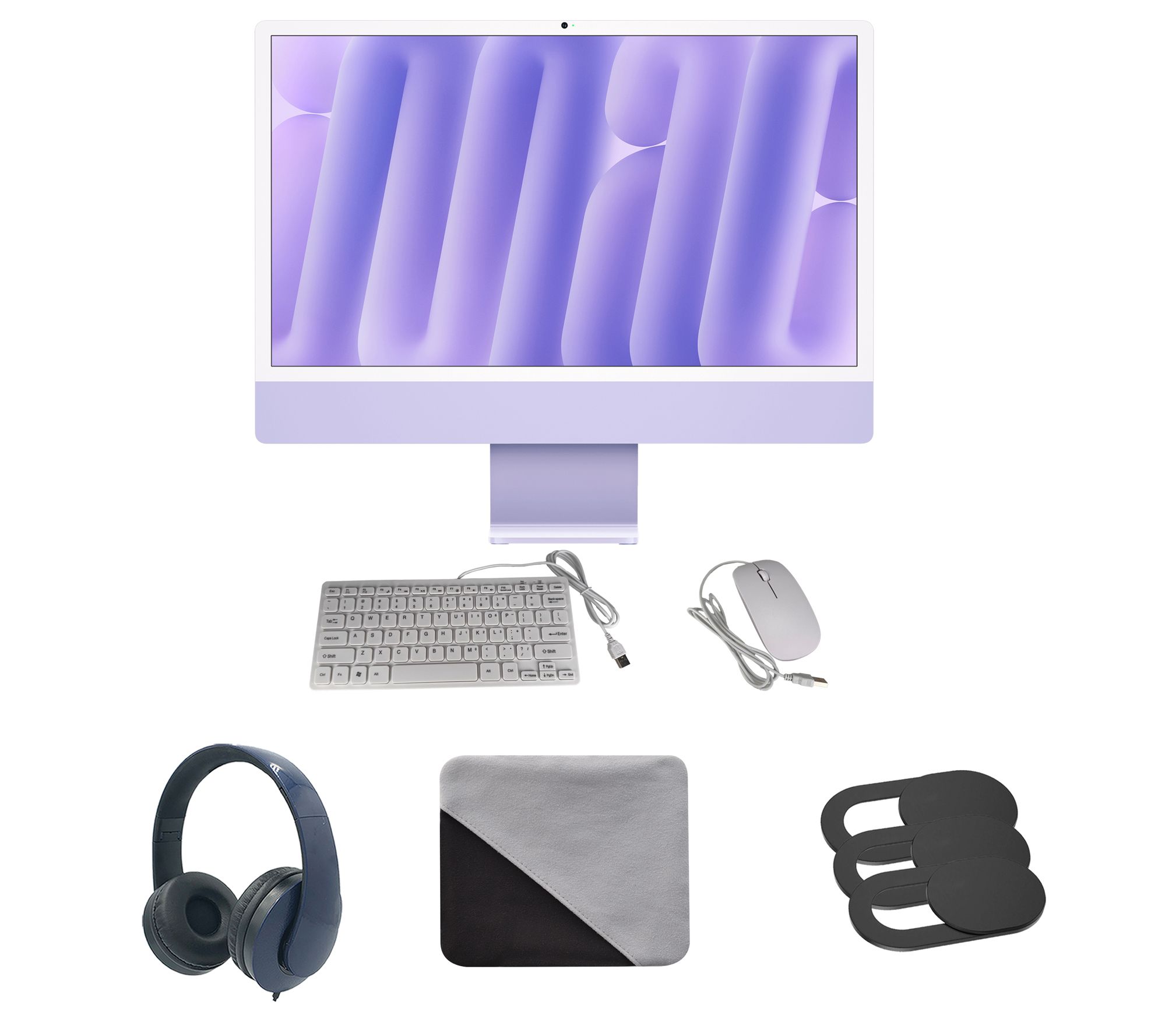 Includes refurbished Apple iMac 24", wired keyboard, wired mouse, power adapter, USB-C-to-Lightning cable, headphones, microfiber cloth, and three-pack slide webcam cover