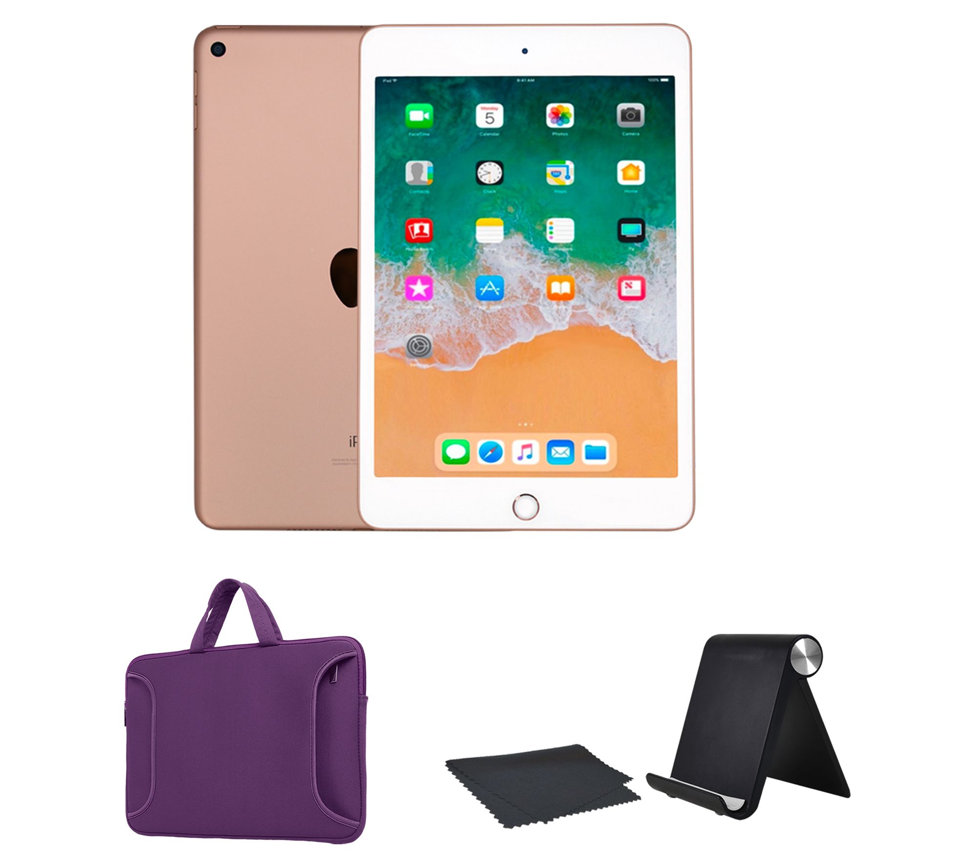 Includes refurbished Apple iPad Mini 5 256GB with Wi-Fi + Cellular, Lightning to USB cable, USB power adapter, carry case, cleaning cloth, and universal tablet stand