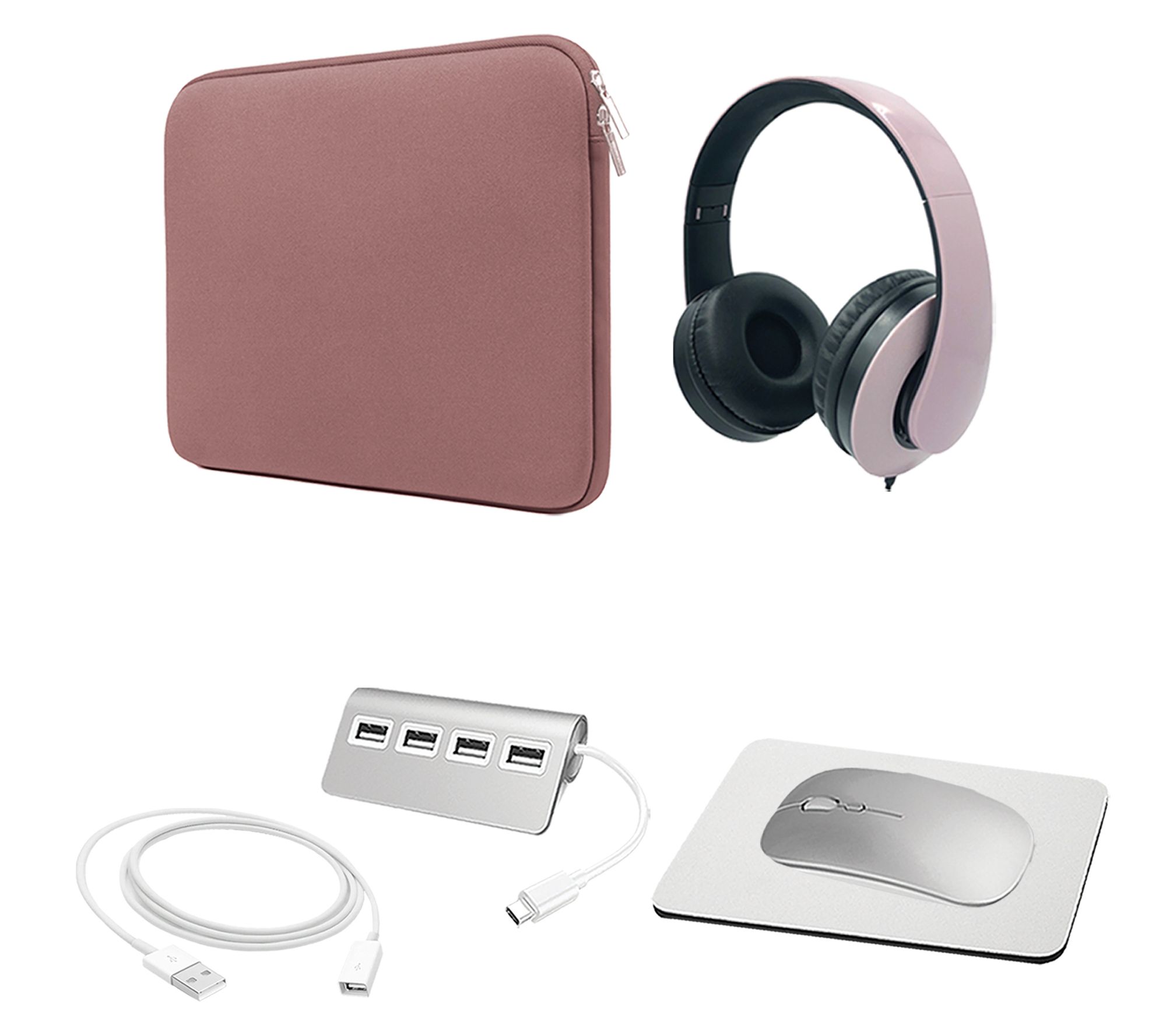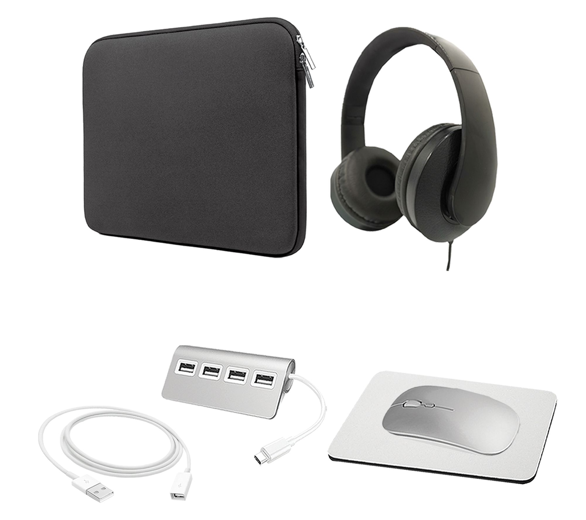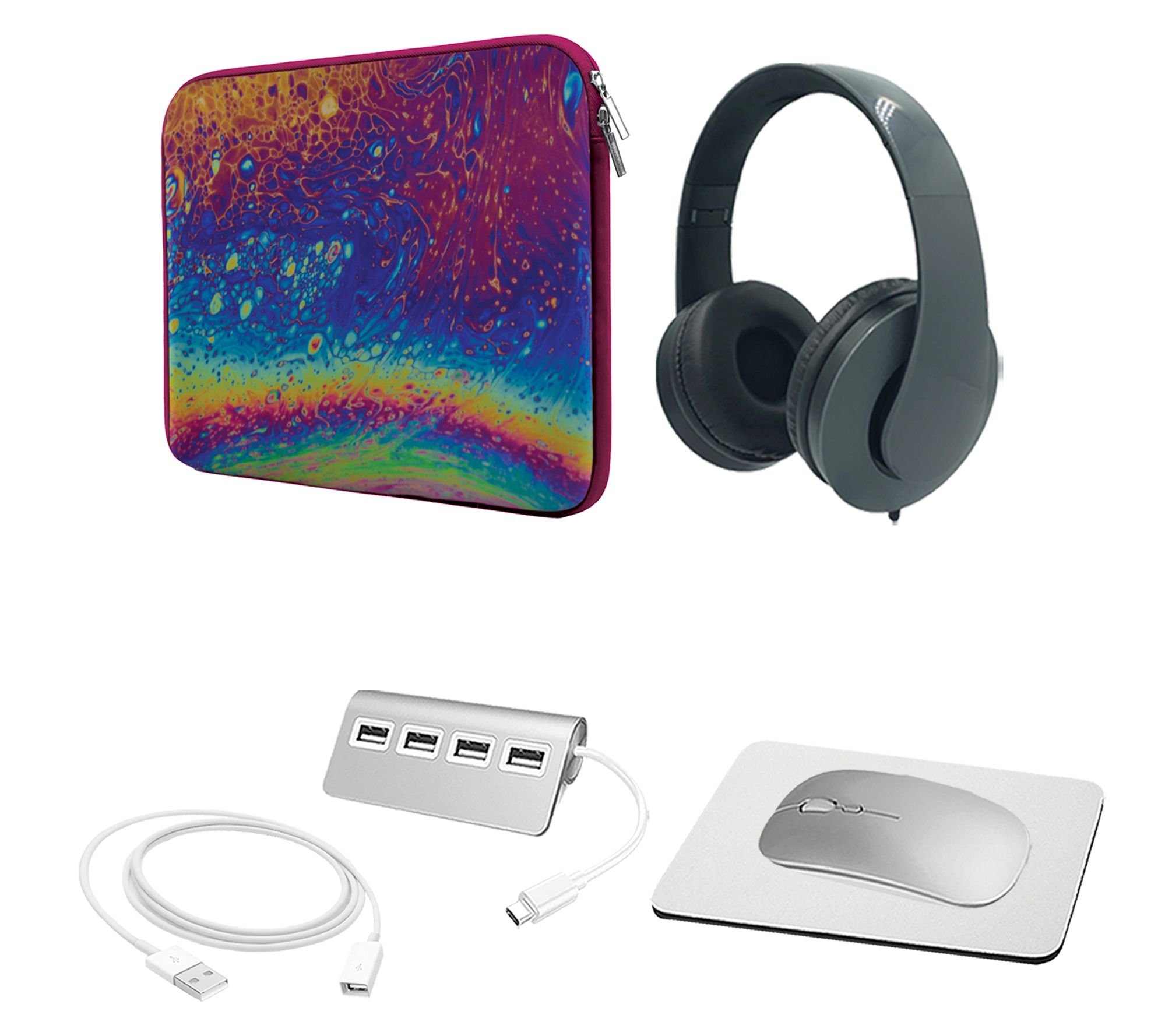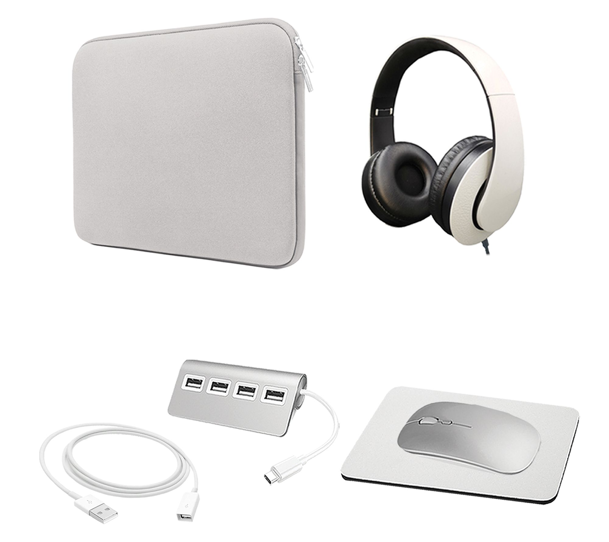 Includes refurbished MRX43LL/A-RB MacBook Pro with USB-C power adapter and USB-C charging cable; neoprene sleeve, wired headphones, wireless mouse, mouse pad, USB-C hub, and USB extension cable