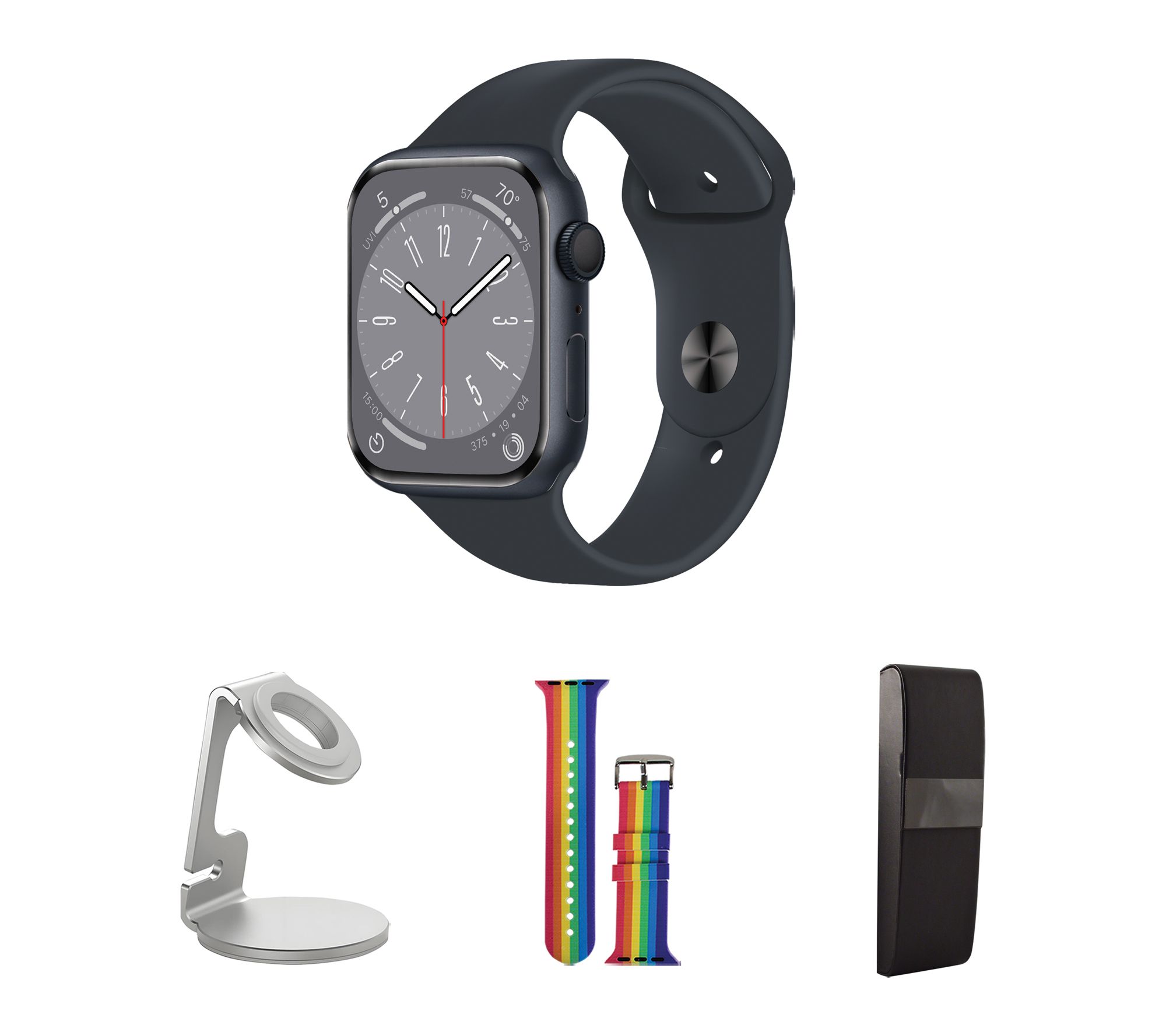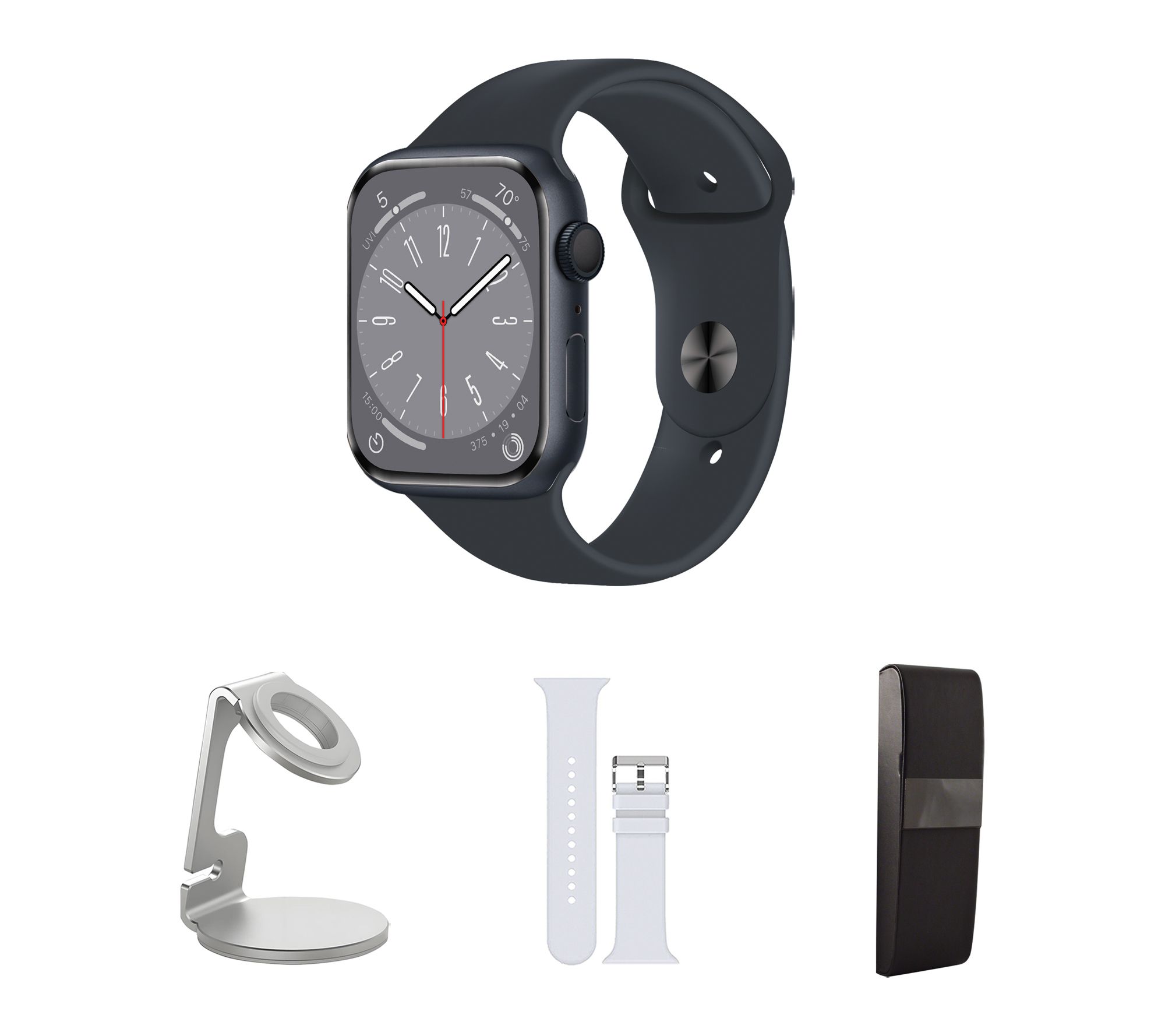 Includes refurbished 2nd-generation Apple Watch SE 44mm with medium/large band and magnetic charging cable; watch stand, silicone band, and hard case
