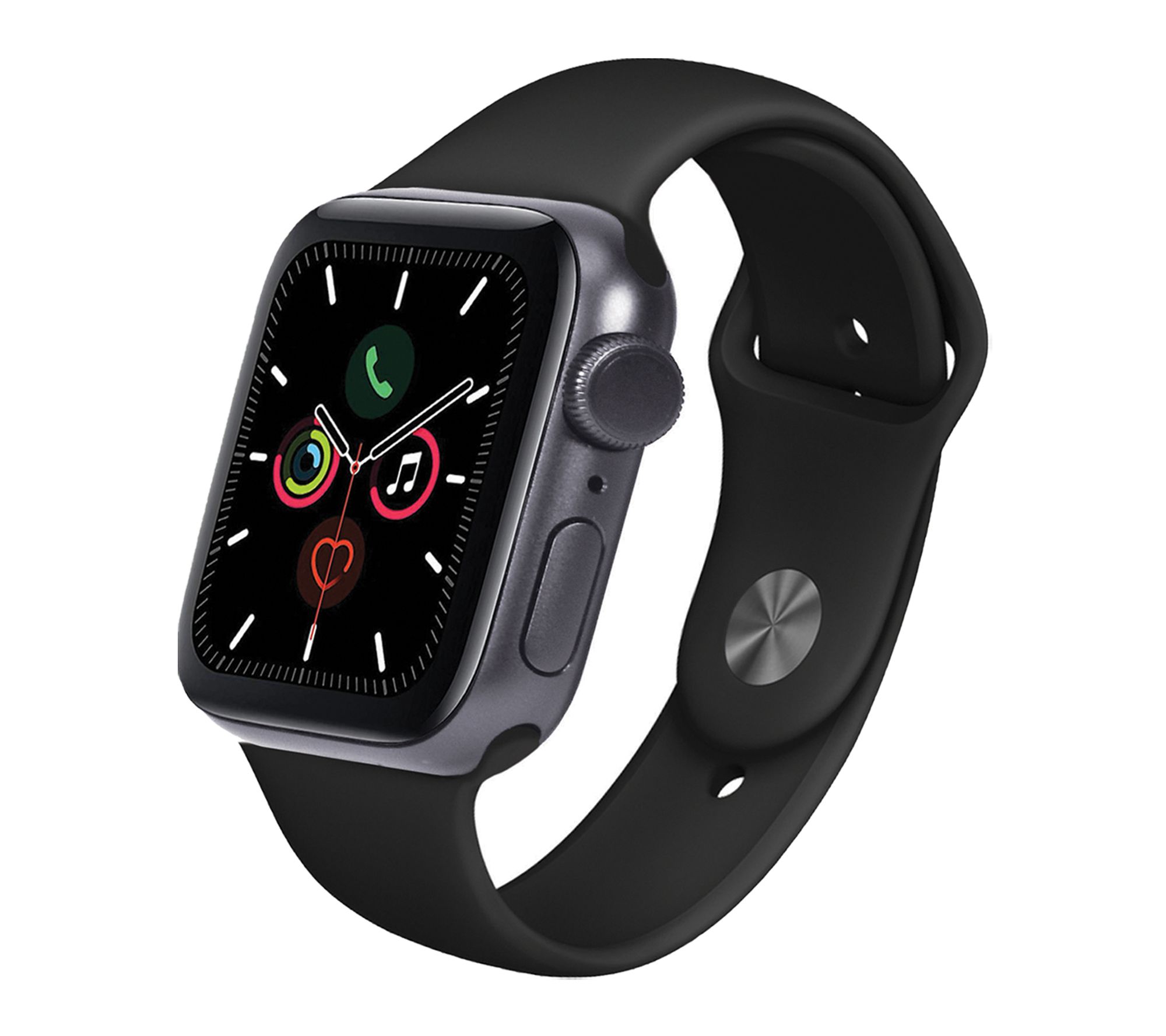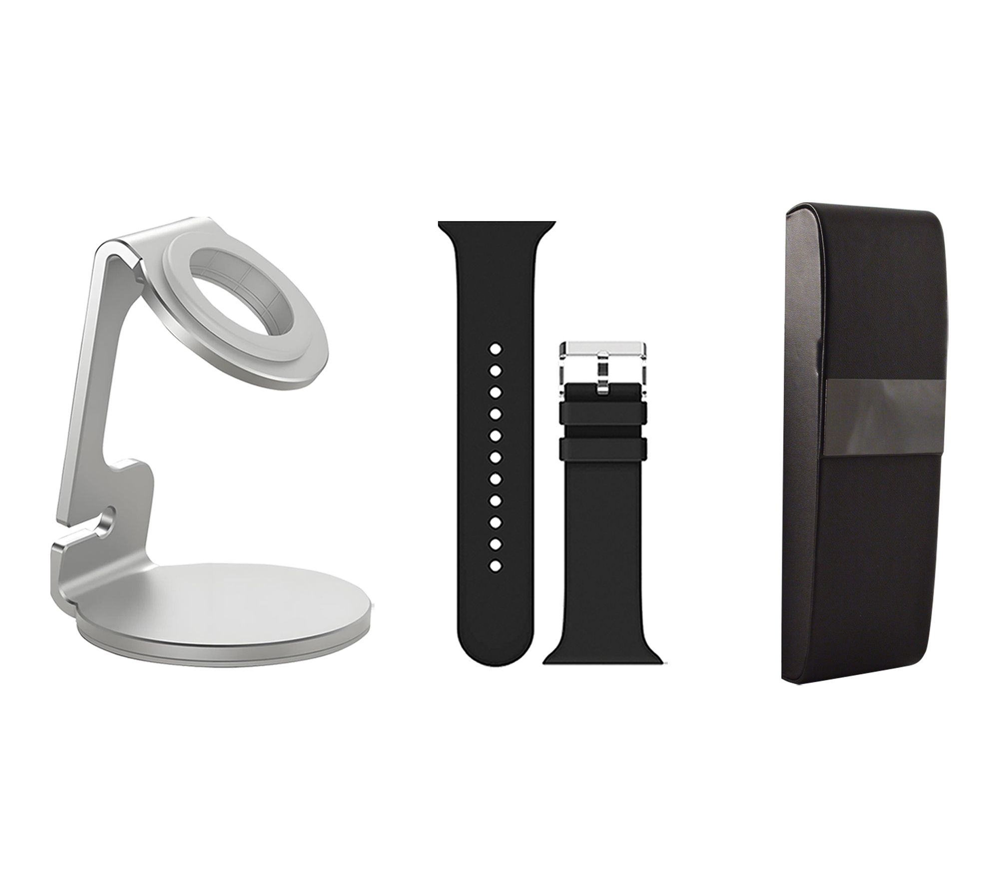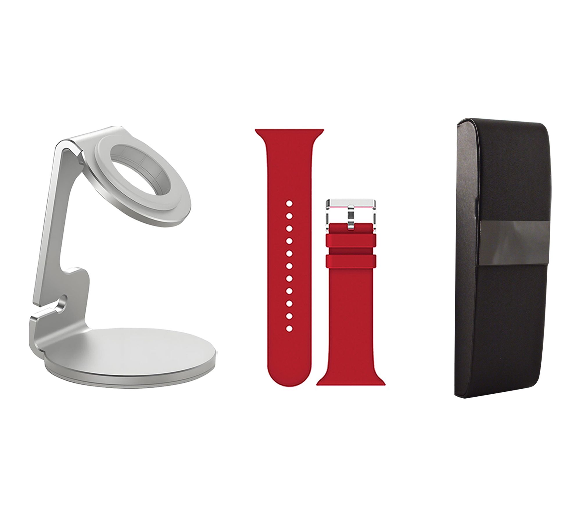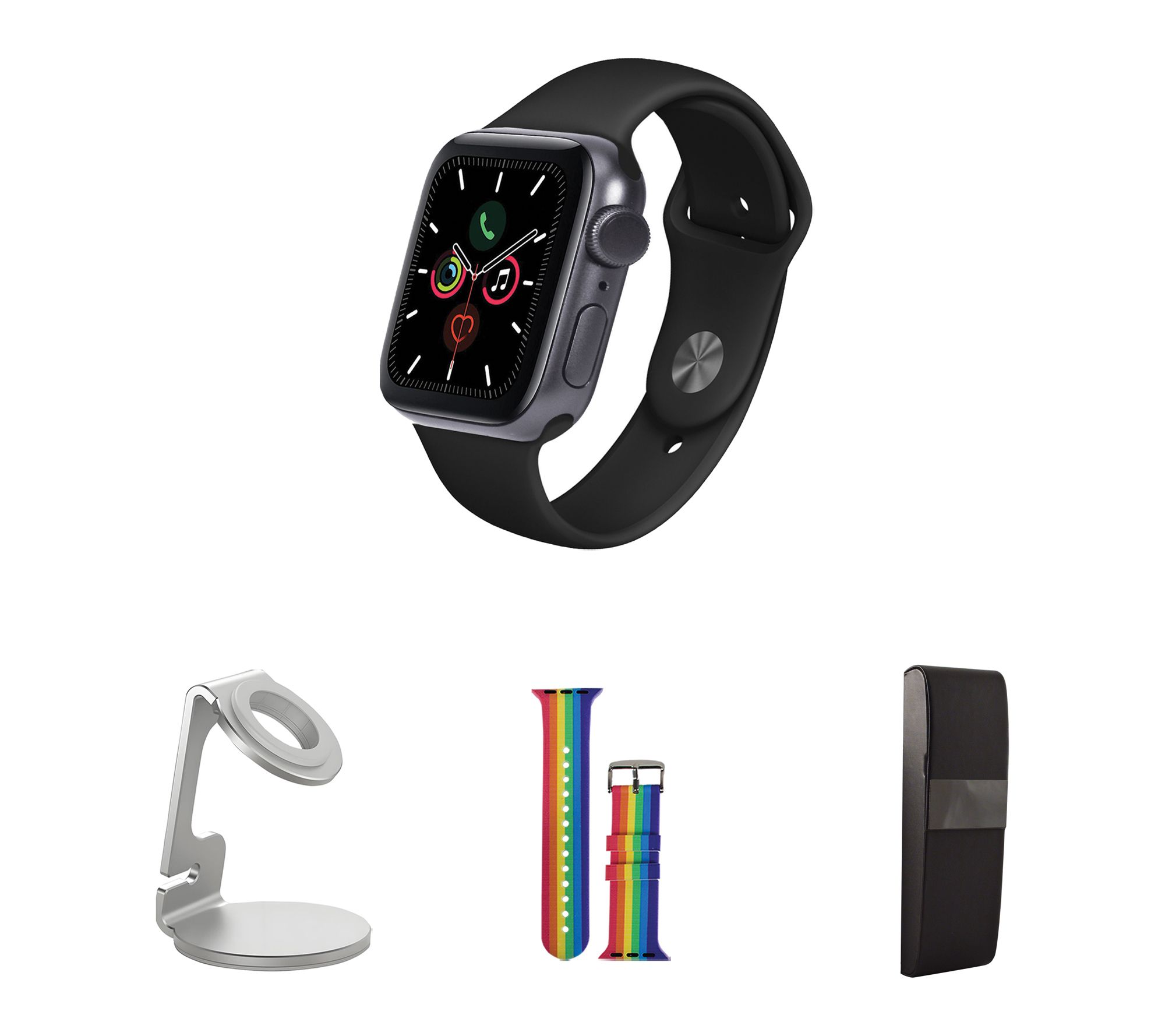 Includes refurbished Apple Watch Series 6 44mm smartwatch with sports band and magnetic charging cable; aluminum charging stand, additional silicone band, and hard case