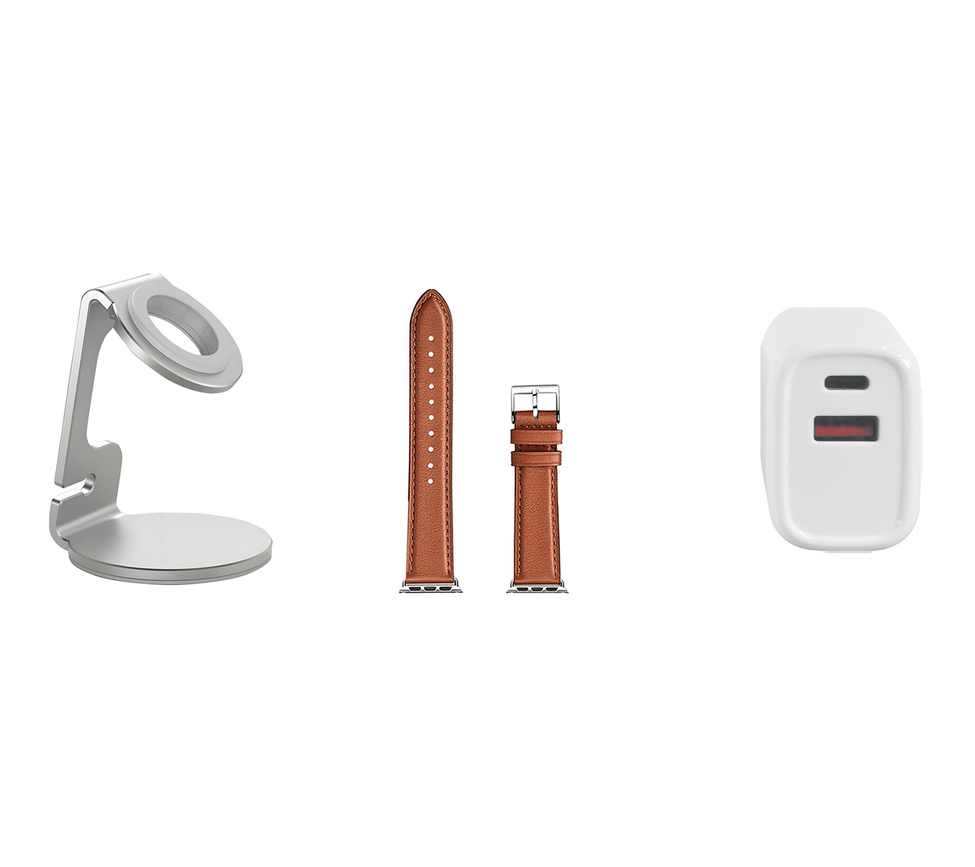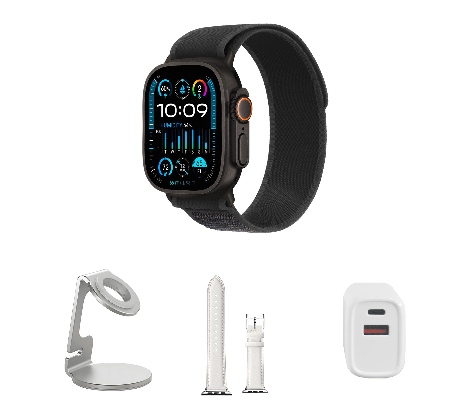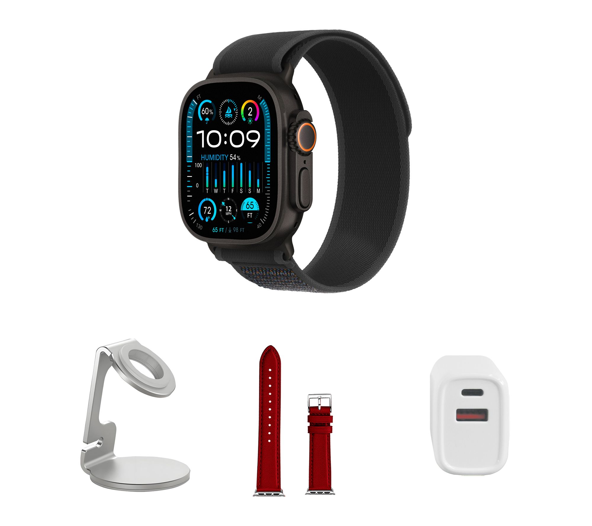 Includes refurbished Apple Watch Ultra 2 49mm with Trail Loop band and magnetic charging cable; charging stand, silicone band, and dual port wall adapter