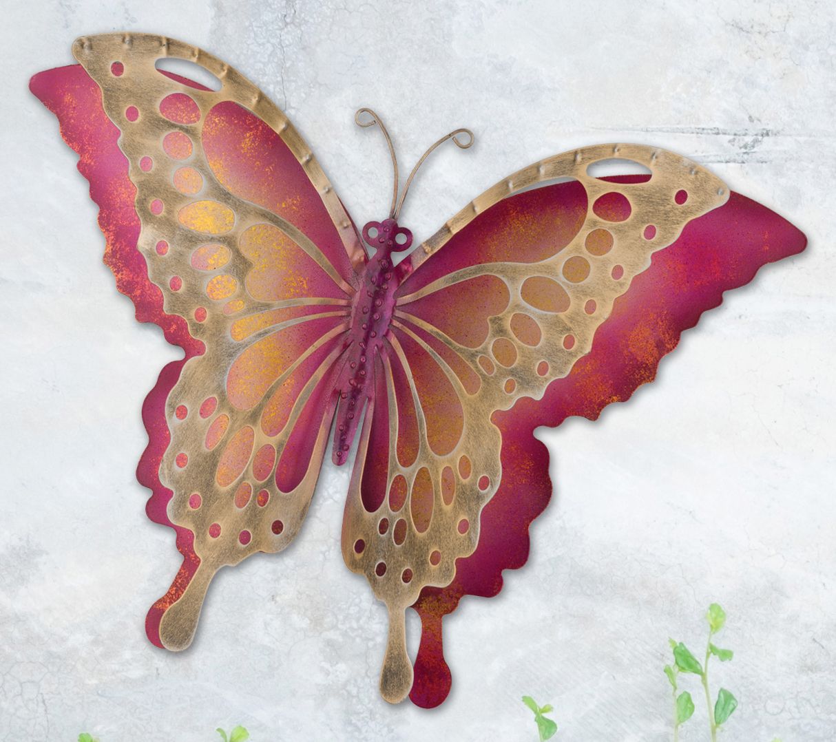 Add a touch of elegance to any space with this stunning butterfly wall decor. Featuring a gorgeous magenta and antique goldtone finish, its two sets of wings give dimension and depth. Hang it inside or outside for a whimsical accent. From Regal Art & Gift.