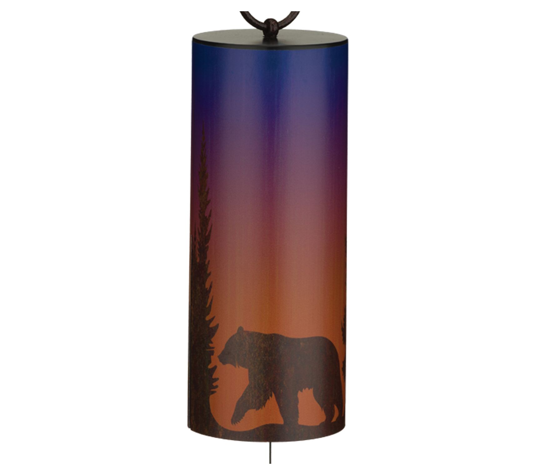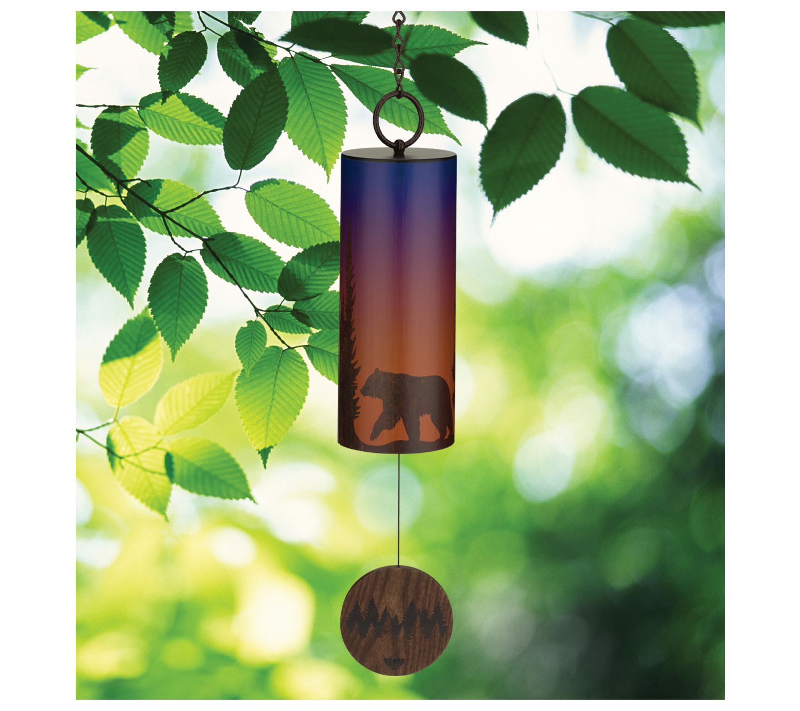 • A setting sun scene with a bear walking in the woods adorns this rich tubular wind bell