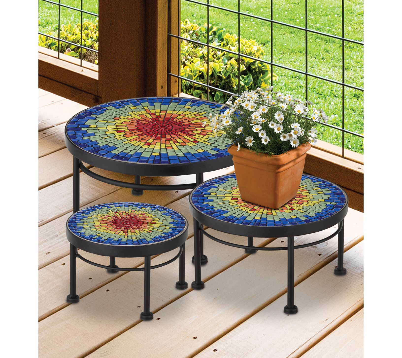 Transform any corner of your home with these colorful, low plant stands. Perfect for displaying vibrant plants or decorative items, their weighted ceramic tops paired with sturdy metal legs add a touch of elegance. These stands nest together for easy storage and efficient shipping. From Regal Art & Gift.