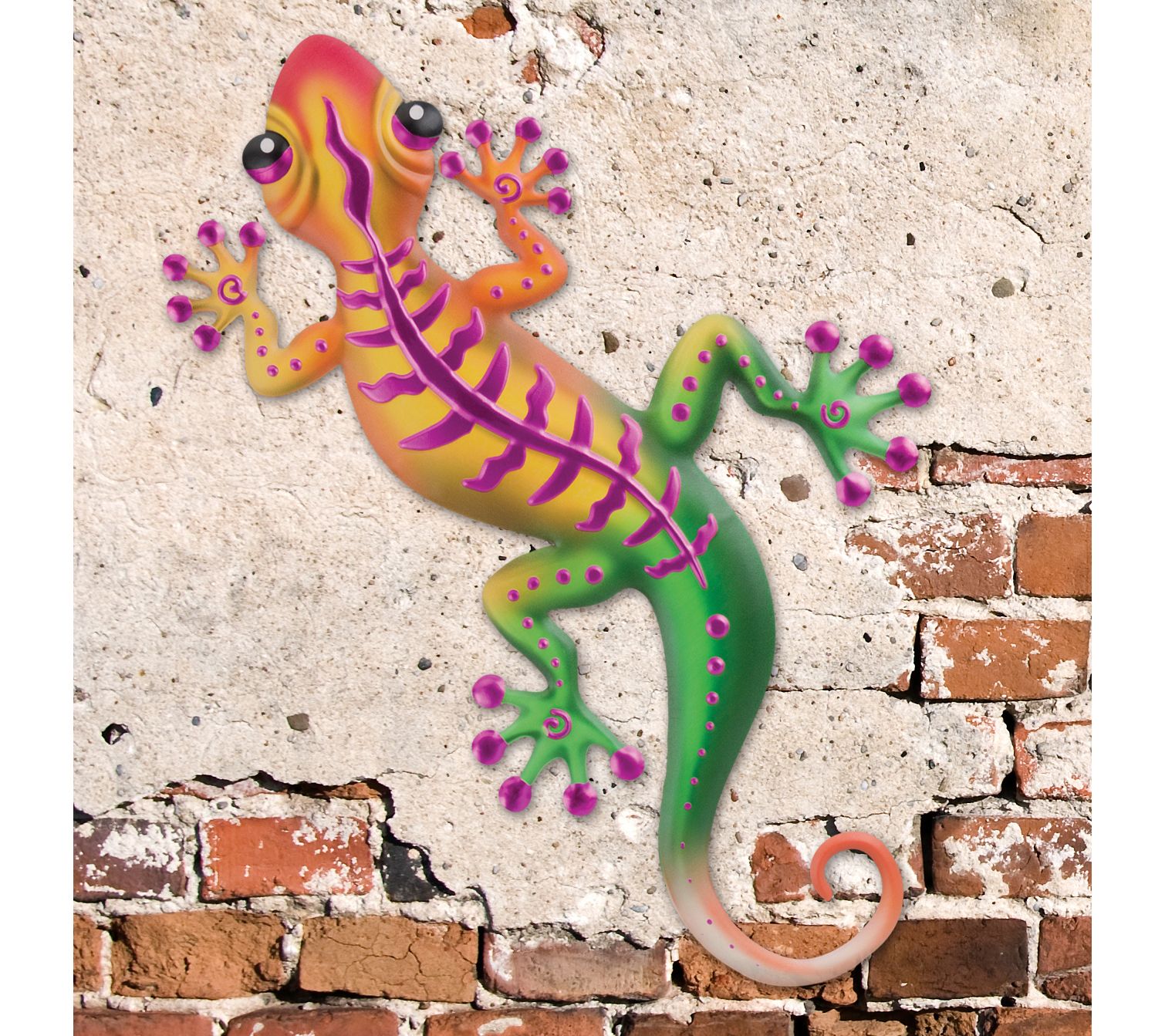Add a splash of vibrant charm to any space with this delightful gecko wall decor. Perfect for both indoor and outdoor settings, its hand-painted, bright metallic design is sure to catch everyone's eye. From Regal Art & Gift.
