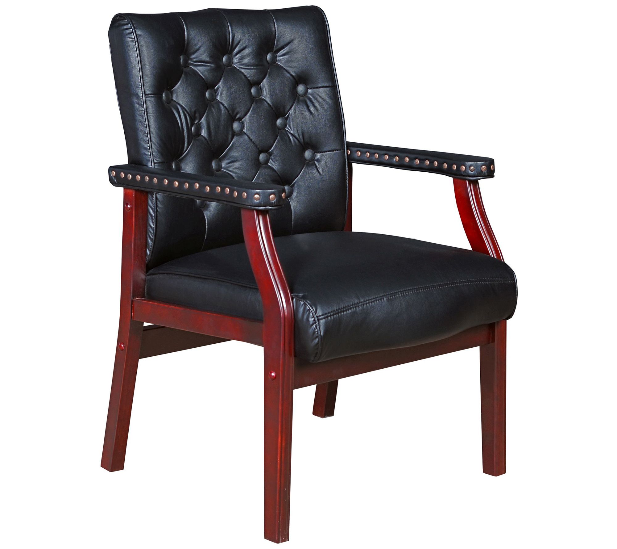 Bring an air of distinction to any traditional home or professional office setting with this eye-catching armchair featuring brass trim accents, durable vinyl upholstery, and elegant button tuft stitching. From Regency.