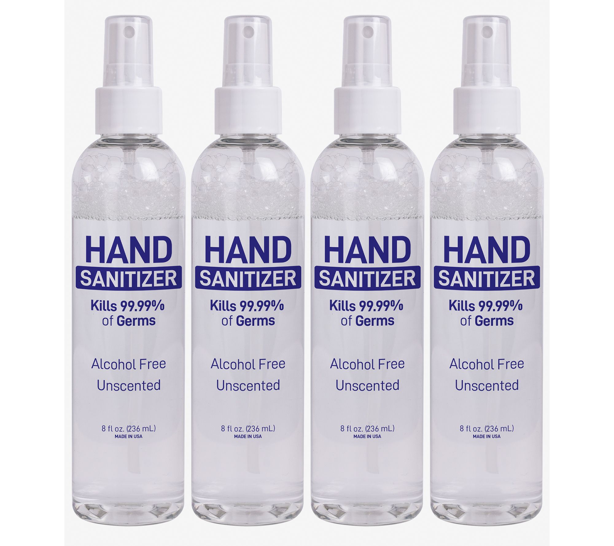 • Includes four 8-oz hand sanitizer bottles with spray nozzles and caps