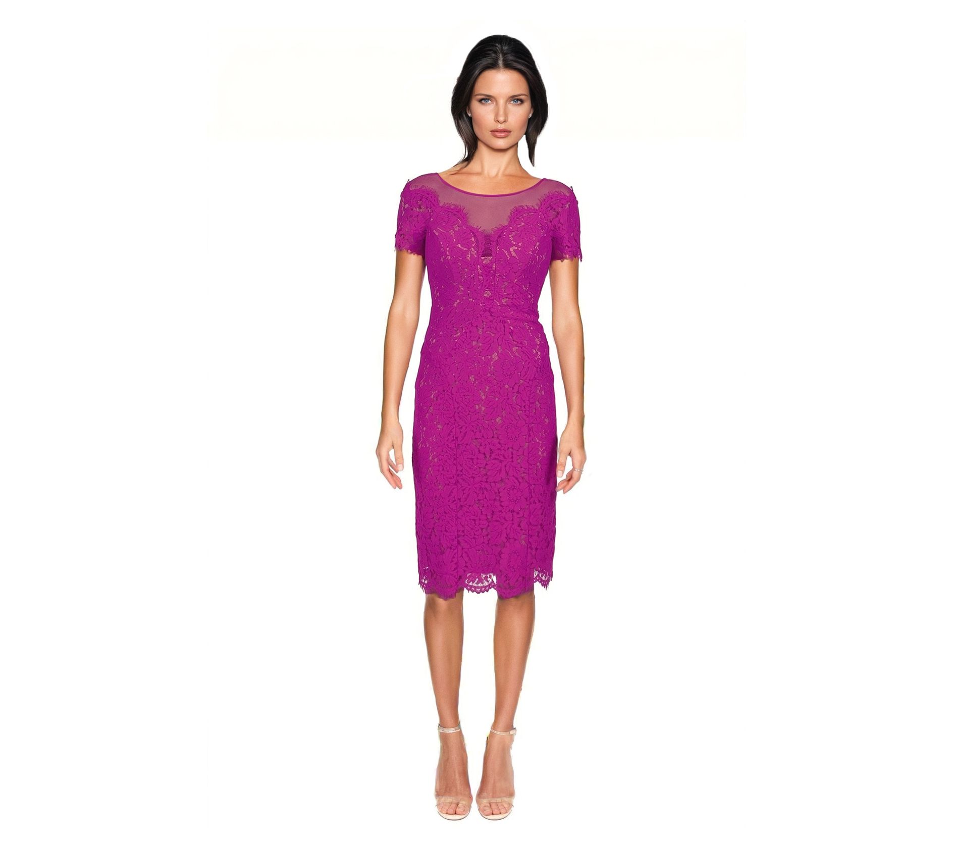 Elevate your evening attire with this lace cocktail dress featuring a mesmerizing illusion neckline that promises to captivate and charm at every turn. This woven masterpiece, tailored to a semi-fitted silhouette, gracefully skims the body, ensuring a stunning presentation for any cocktail occasion. From Rene Ruiz Collection.