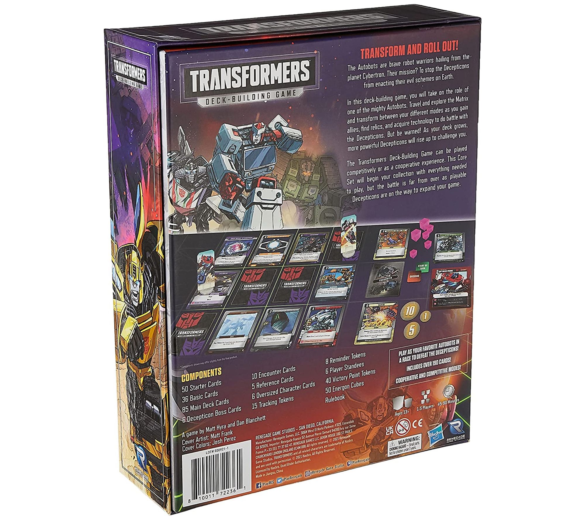 • Includes 50 starter cards, 36 basic cards, 85 main deck cards, six Decepticon Boss cards, 10 encounter cards, five reference cards, six oversized character cards, 15 tracking tokens, eight reminder tokens, six player standees, 40 victory point tokens, 50 Energon Cubes, and a rulebook
